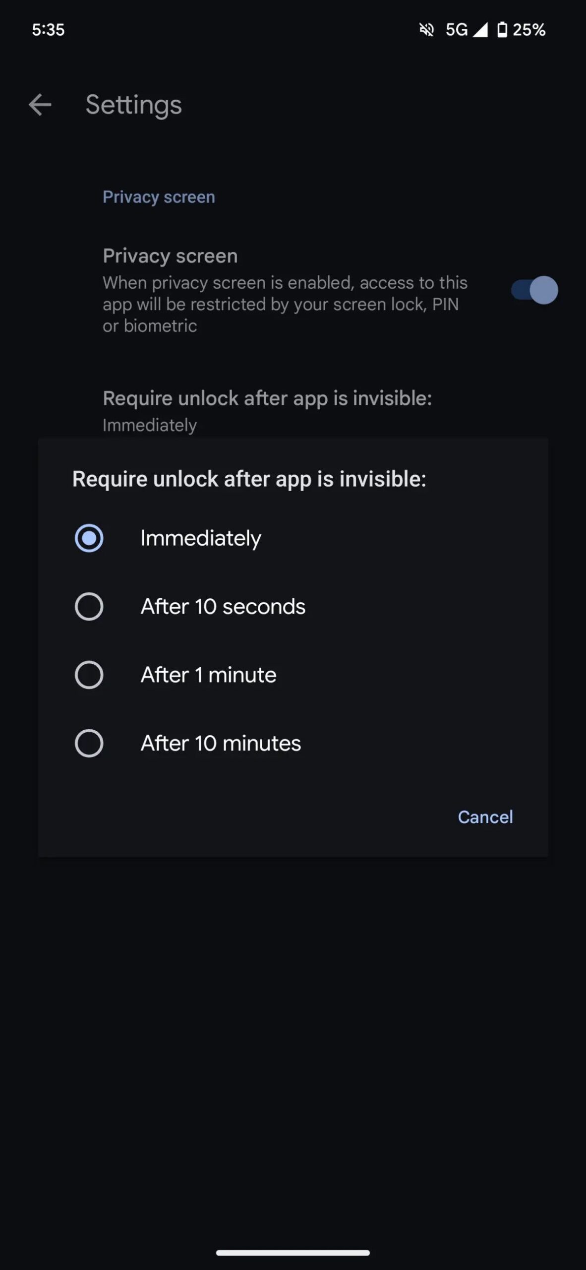 In the Settings menu, a new “Privacy” screen feature will restrict app access with a screen lock, PIN, or biometric authentication. Users can choose the required unlock time after the app becomes inactive, with options ranging from immediate to 10 minutes.