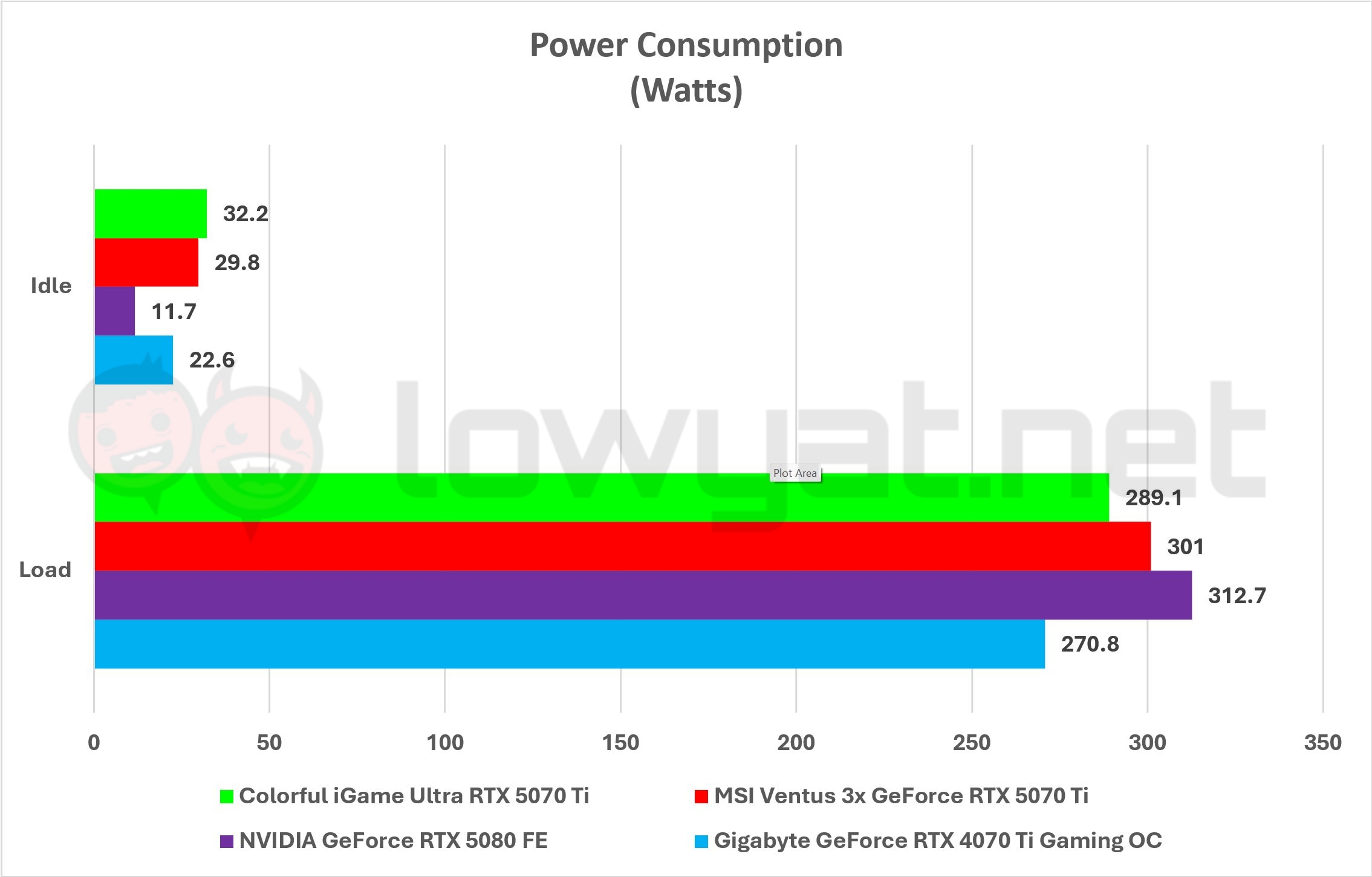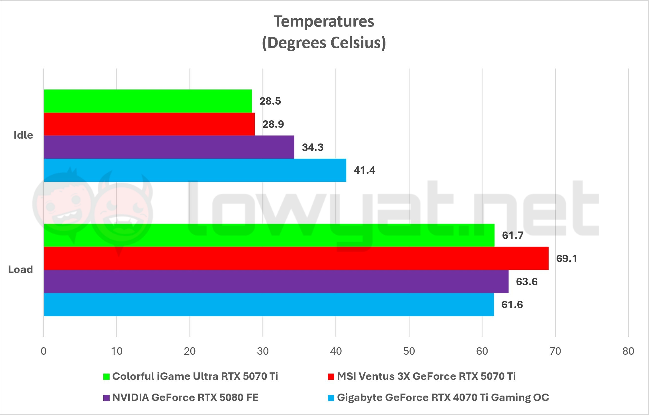 Perhaps one slight benefit that works in the favour of the iGame Ultra RTX 5070 Ti is that it runs a lot cooler than the Ventus 3X but again, that’ll be the massive chunk of metal sitting atop the GPU working overtime when gaming or running productivity tests. That, and the three fans that barely need to raise their decibels, even when working at full whack.