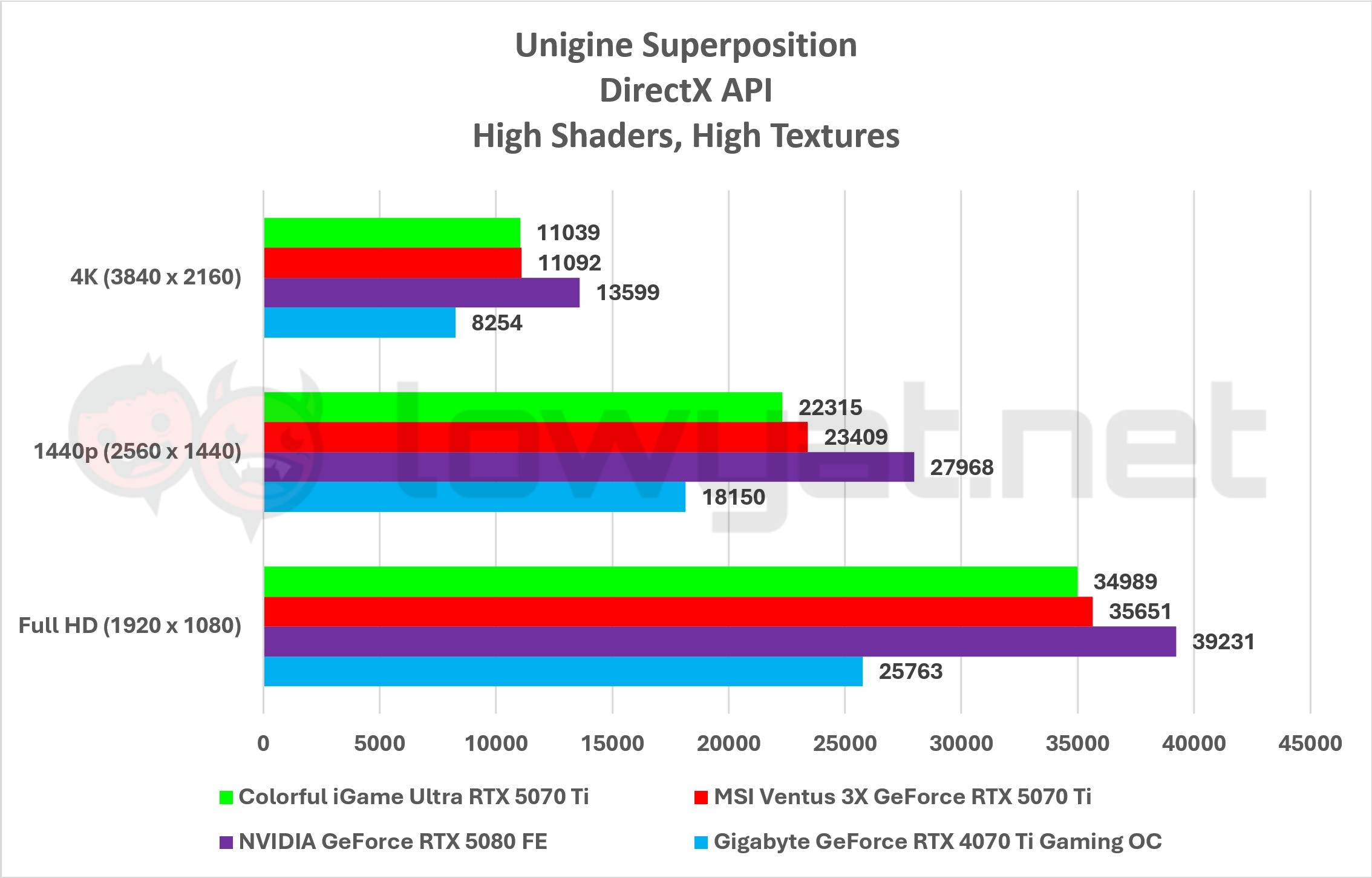 So, whether on normal or Turbo mode, the iGame Ultra RTX 5070 Ti performs more or less the same as the Ventus 3X, albeit just a little slower, if we’re being nitpicky. The synthetic benchmarks prove that point and show it basically matches our control card in each test.