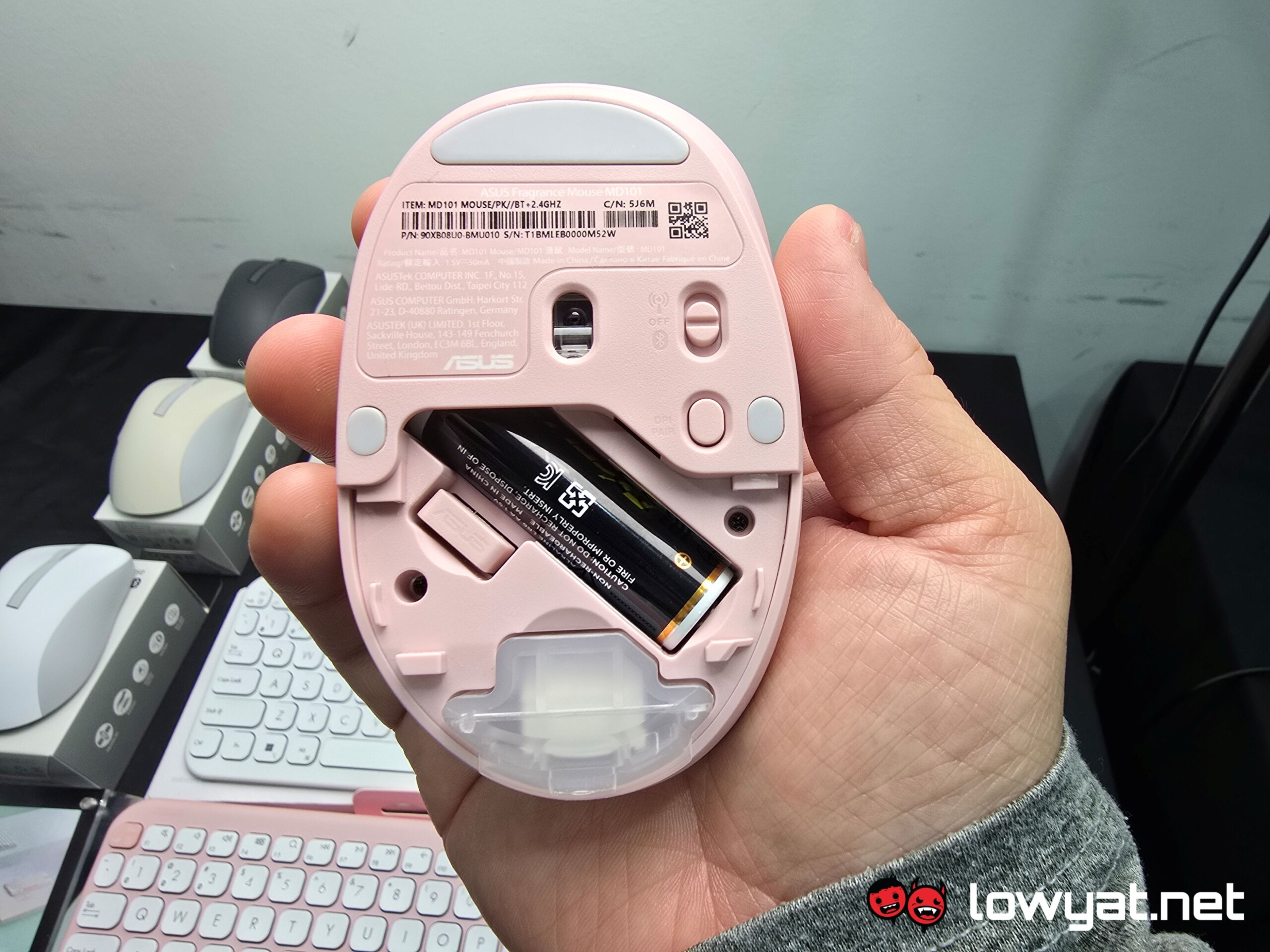 As for the other specifications, the mouse weighs about 66g without the battery and fragrance, features three buttons, and has a maximum DPI of 2,400. According to ASUS, the switches offer a 10-million-click lifespan. Additionally, a single AA battery will keep the mouse powered for up to a year.