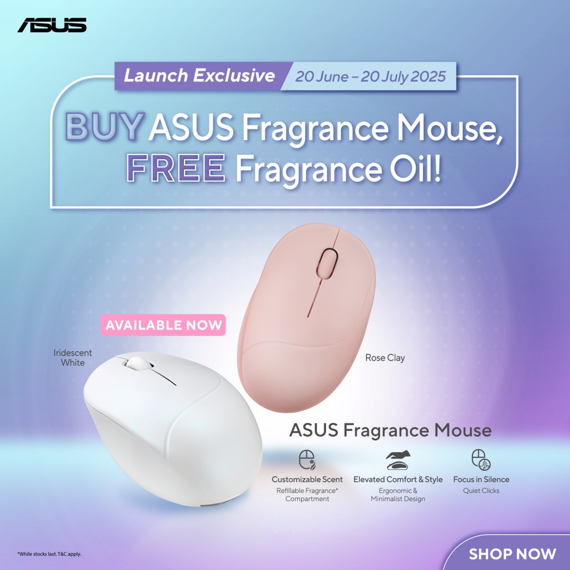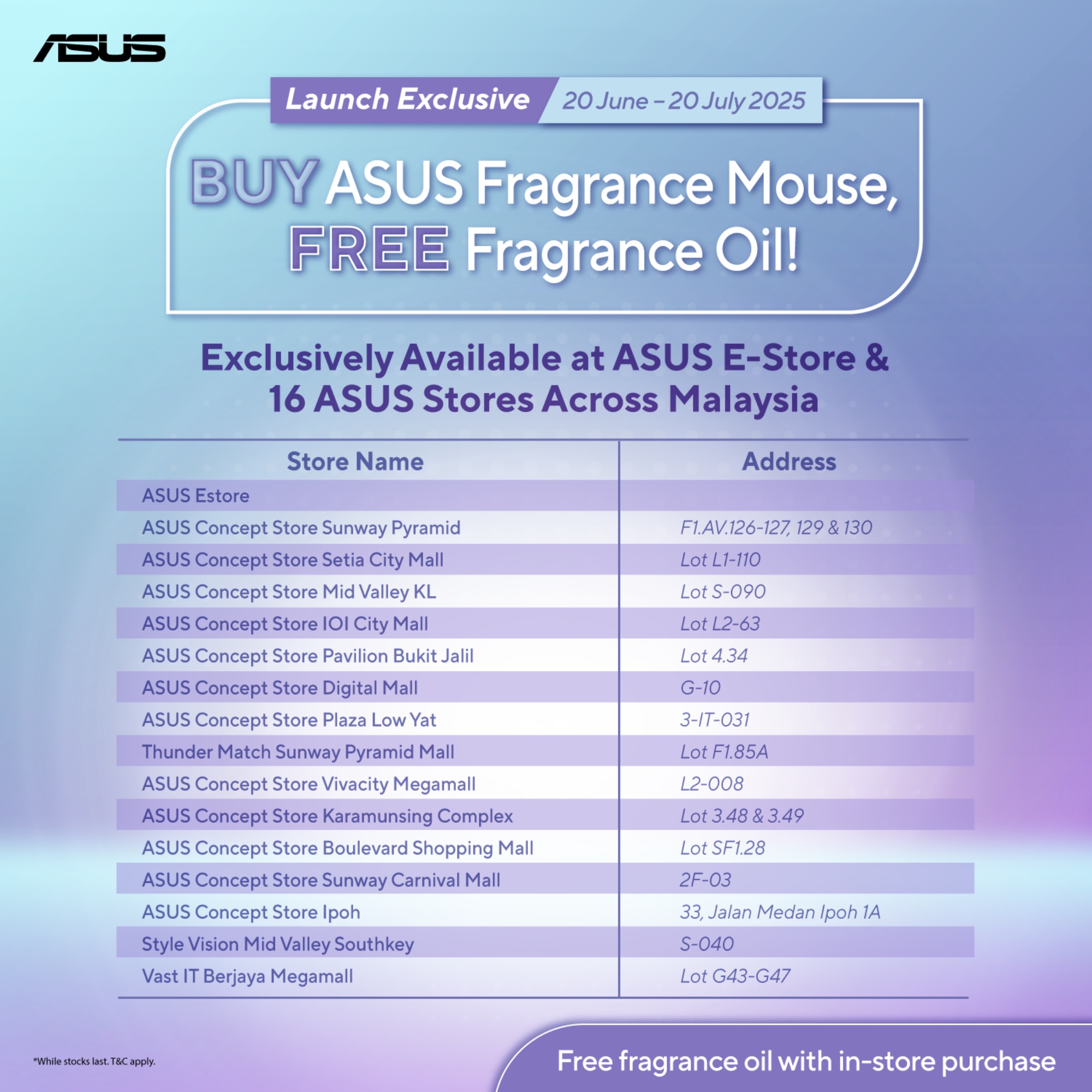 To celebrate the launch of the ASUS MD101 Fragrance Mouse, the brand is offering an exclusive deal until 20 July 2025. Customers purchasing the mouse from the participating stores are entitled to receive a free fragrance oil while stocks last.