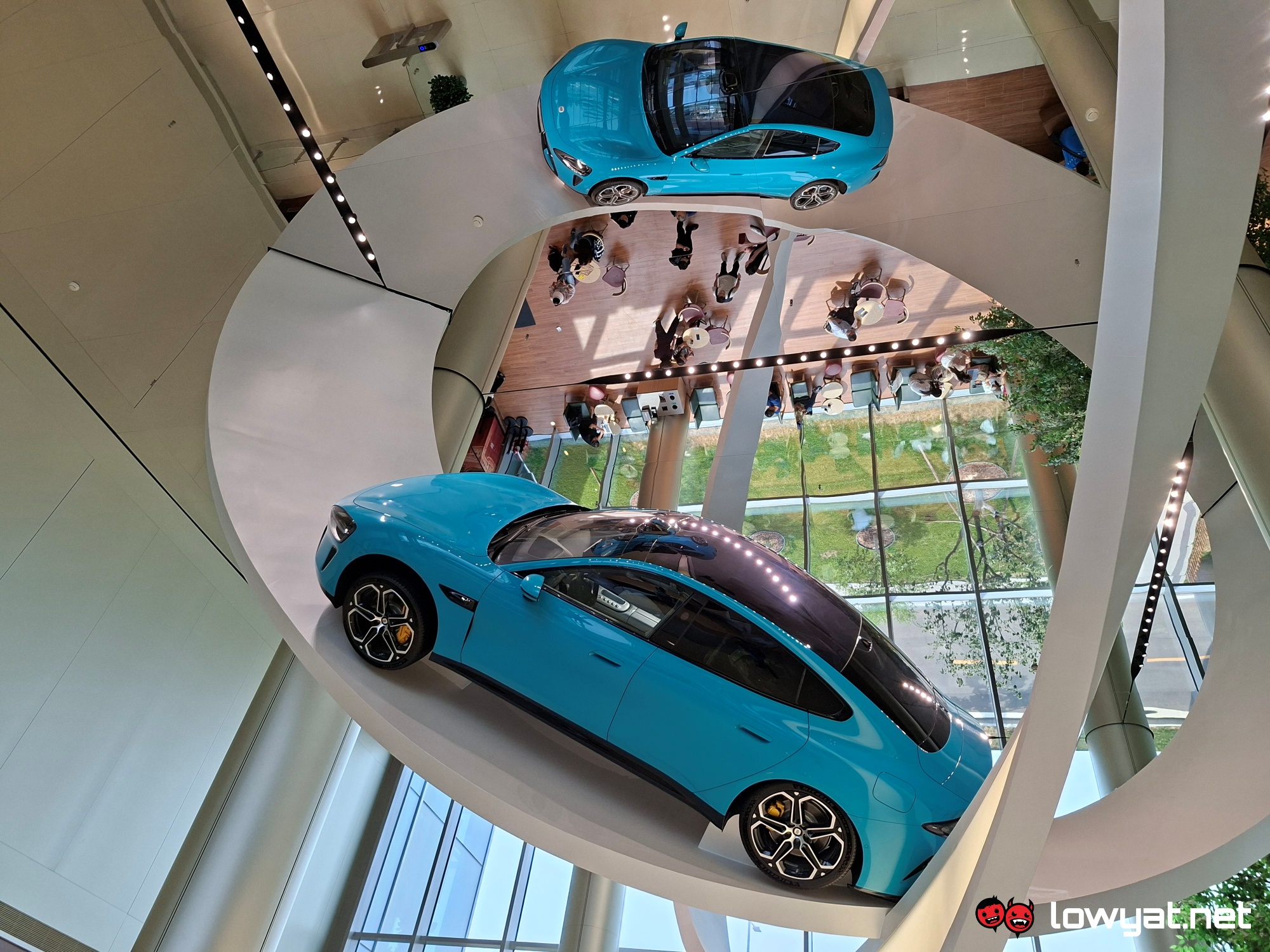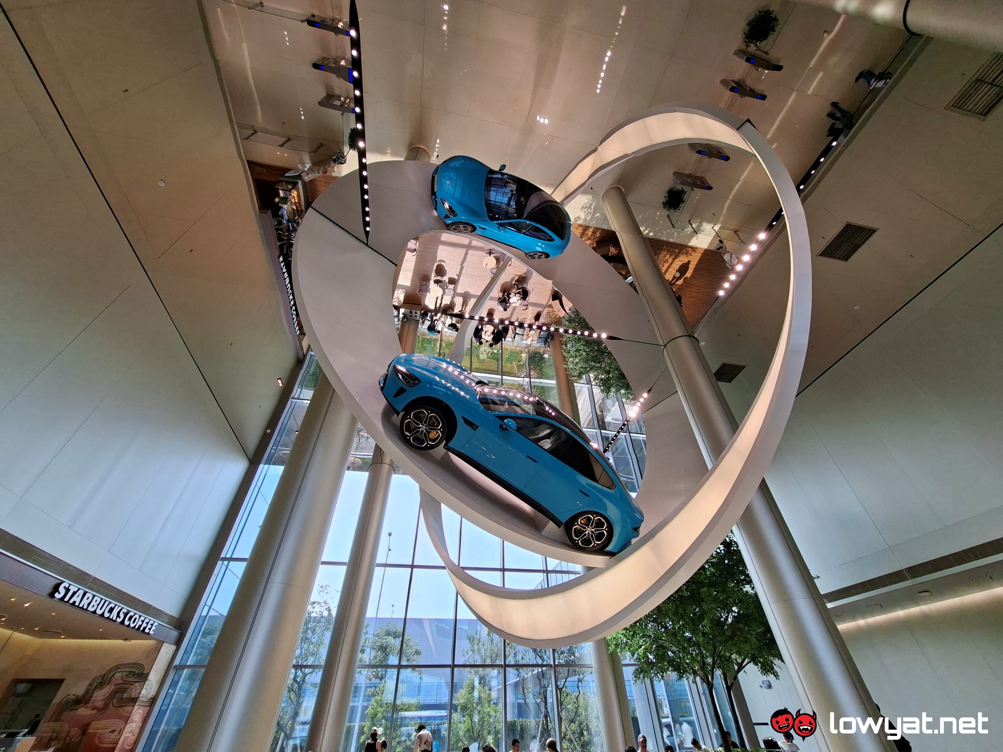 Upon arriving at the lobby, we were greeted by the sight of an SU7 Max suspended from the ceiling. The car is mounted on what the company calls a Mobius Strip frame, creating an eye-catching display drawing the immediate attention of every visitor.