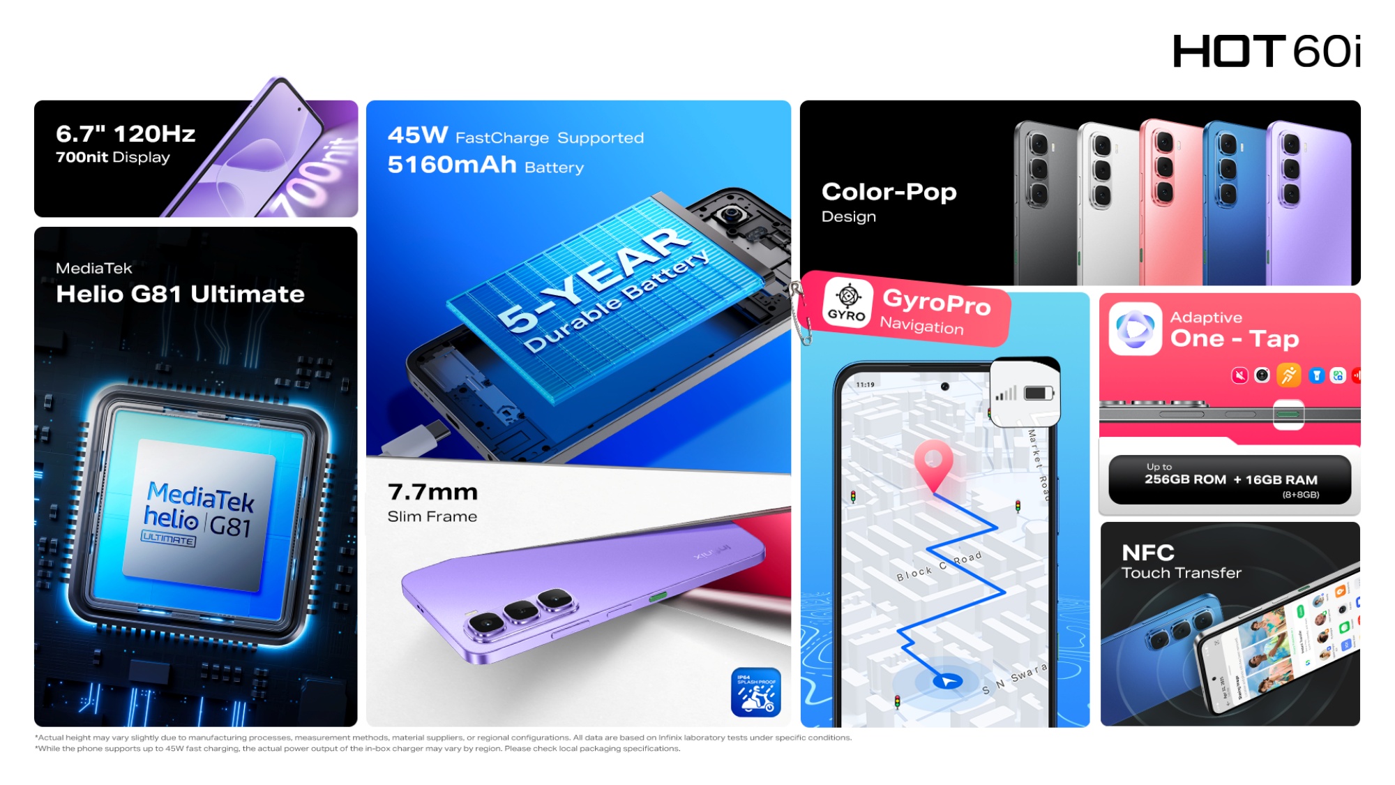 Meanwhile, the Hot 60i is powered by a MediaTek Helio G81 Ultimate SoC, with 8GB of RAM and 256GB of storage. It also packs a 5,160mAh battery with 45W charging and 10W reverse charging. It also supports WiFi 5 and NFC, but unlike the Hot 60, it is limited to 4G and Bluetooth 5.3.
