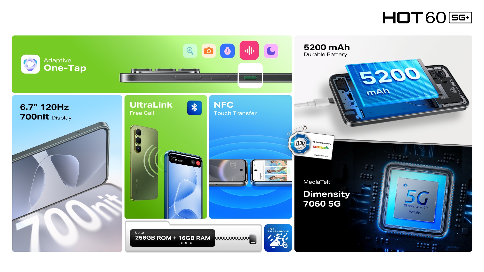The internals are where the phones differ, as the Hot 60 is equipped with a MediaTek Dimensity 7060 5G chipset, paired with 8GB of RAM and 256GB of storage. Powering the phone is a 5,200mAh battery with support for 18W wired charging and 10W reverse charging. For connectivity, the device supports WiFi 5, 5G, Bluetooth 5.4, and NFC.