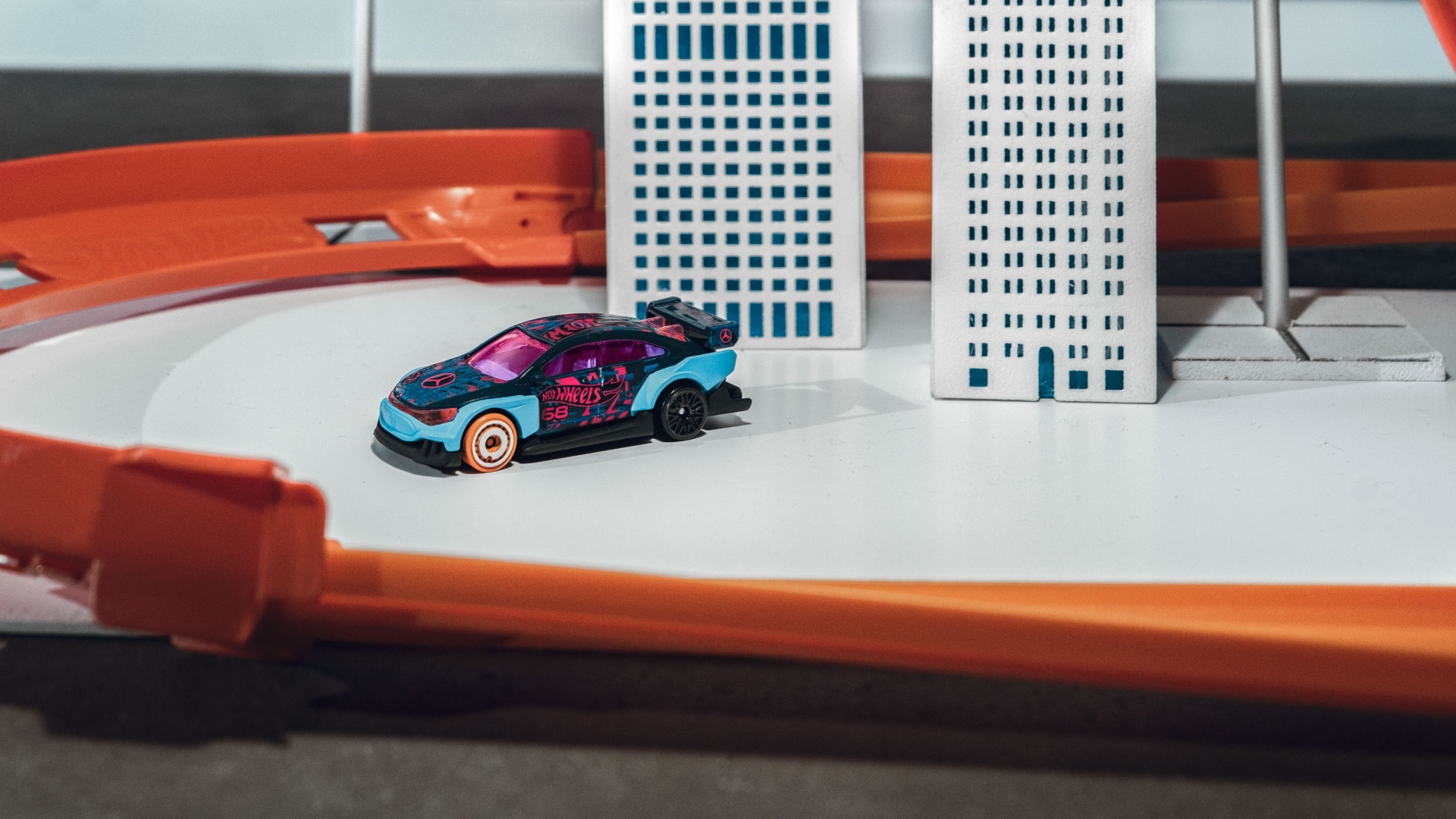 The CLA stands out with its striking shades of black, pink and blue. The model also features solid, moulded “windows”, imitation shutlines, and glossy wheels. True to the Hot Wheels tradition of over-the-top design, this CLA embraces a dramatic DTM-inspired widebody kit. The flared arches, aerodynamic fins and enormous rear wing and diffuser give it an aggressive look.