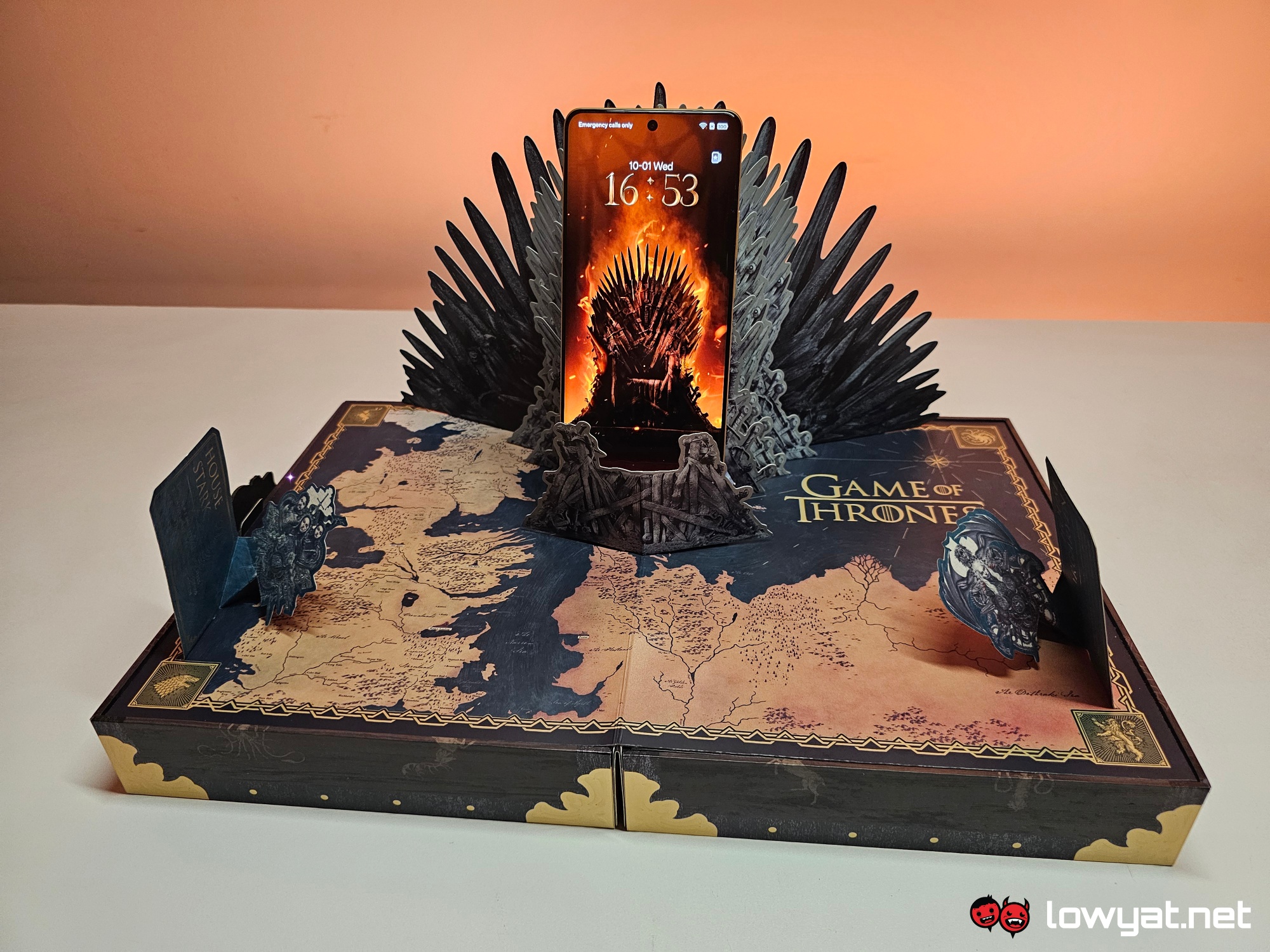 Last but not least, completing the entire package is the included limited edition gifting box, with an exterior design inspired by the Map of Westeros, along with Daenerys’ dragon egg wooden chest. It includes an Iron Throne Phone Stand, a parchment letter that only exposes its contents under UV light, the King’s Hand pin, as well as a set of customised Game of Thrones goodies such as a phone case, postcards and stickers.