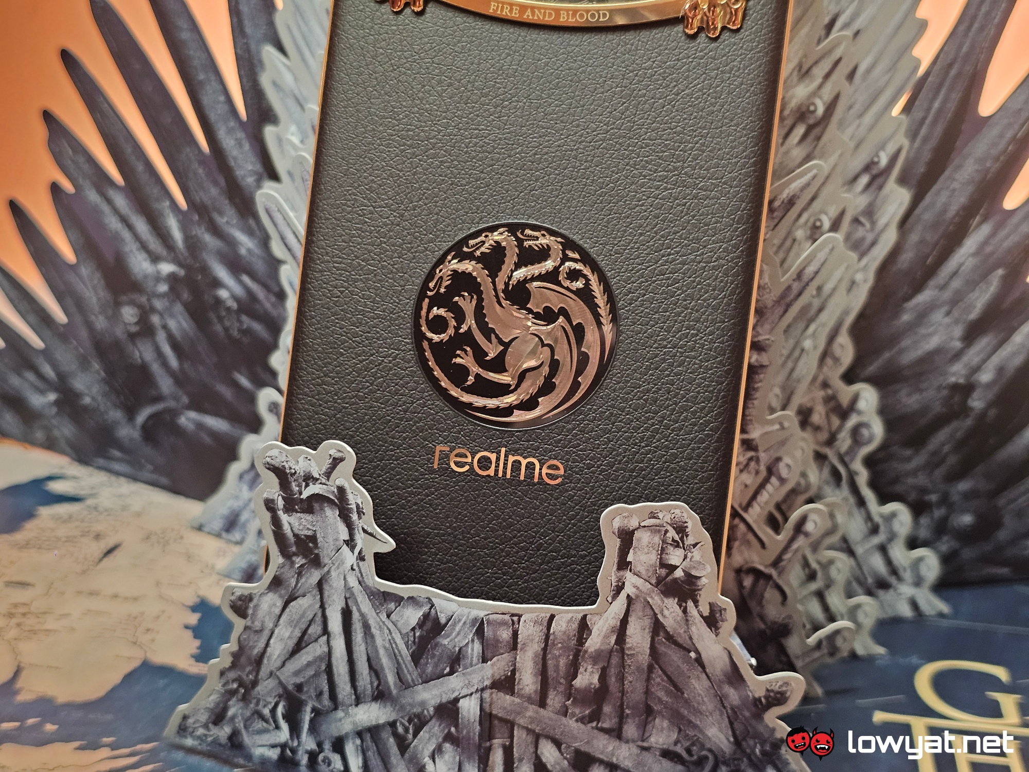 According to realme, the colour changing rear panel is inspired by Daenerys Targaryen’s rebirth in fire. But rather than exposing the limited edition smartphone to fire (don’t actually do that), you can trigger the colour shift by pouring water that’s heated over 44 degrees Celsius. By doing so, the black leather-like rear panel will then change into a striking red colour, but only for a brief moment. Amusingly, the red shade used, together with the existing gold elements, somewhat changes the phone to be in theme with House Lannister, but only colour-wise.