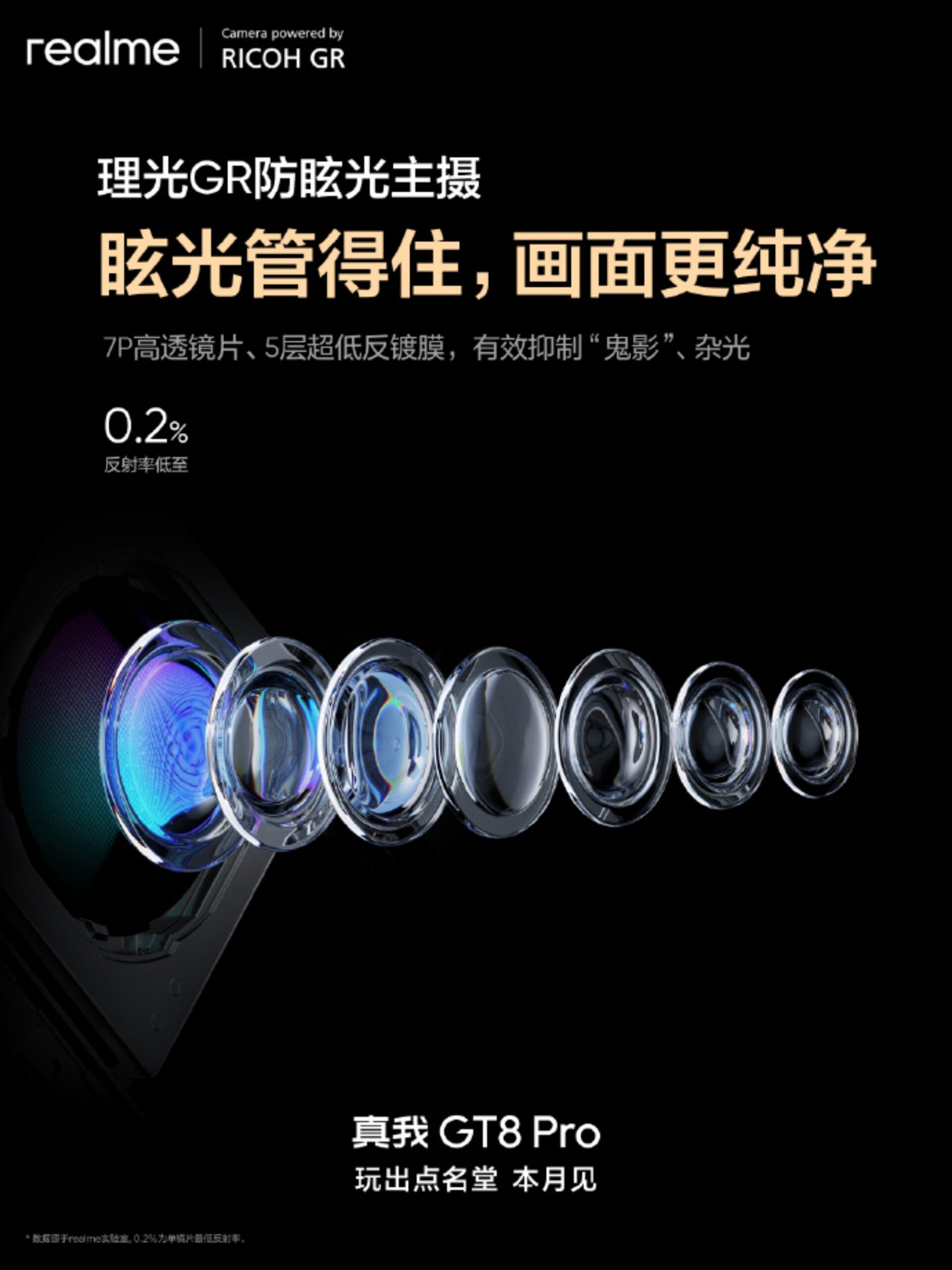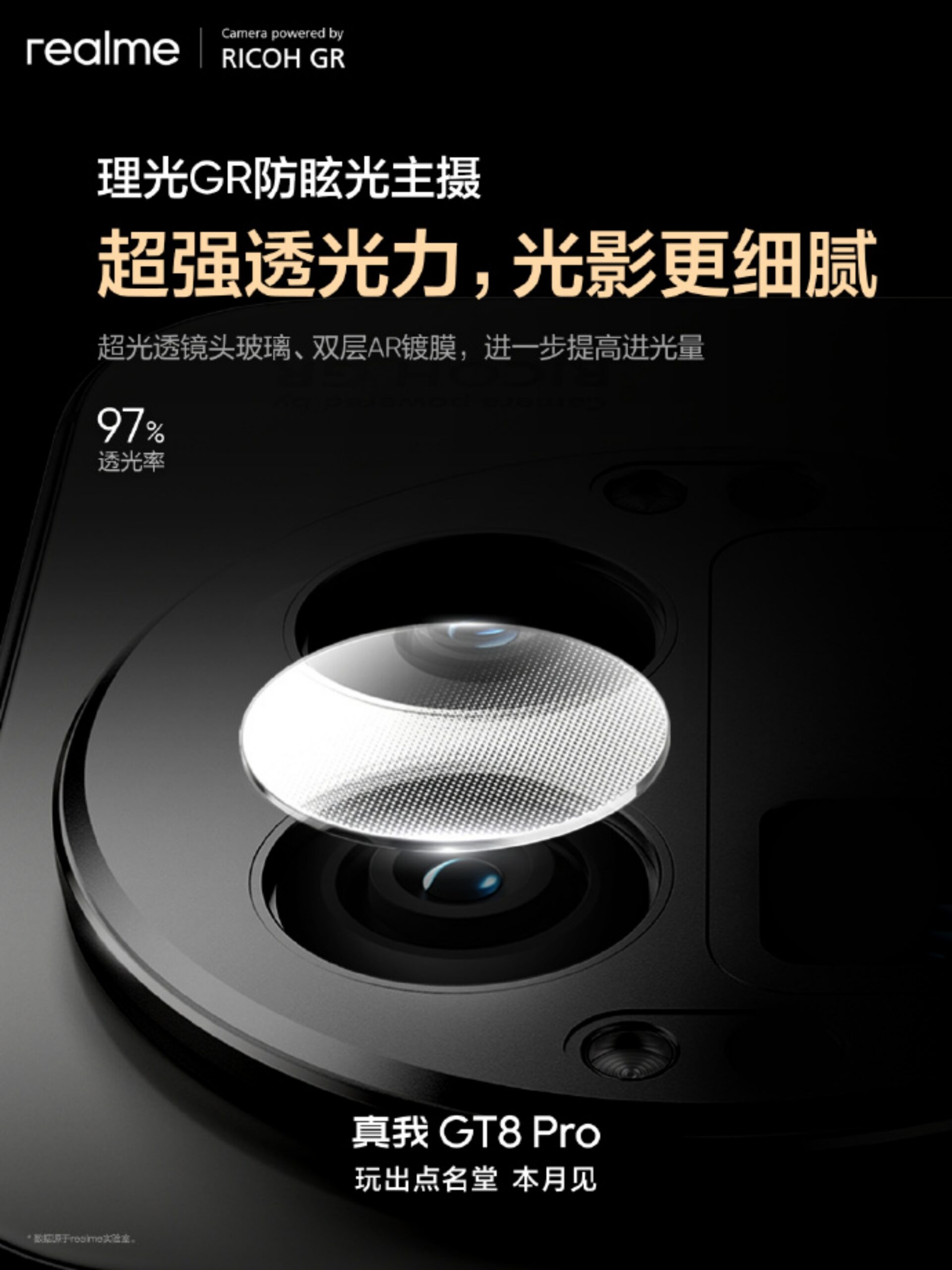 For starters, the realme GT 8 Pro will feature what the company calls a “Ricoh GR anti-glare main camera”. This setup includes a 7P anti-glare lens and a five-layer coating to reduce reflections. An ultra-transparent lens glass with double-layer AR coating serves to increase light intake for a light transmittance of up to 97%.
