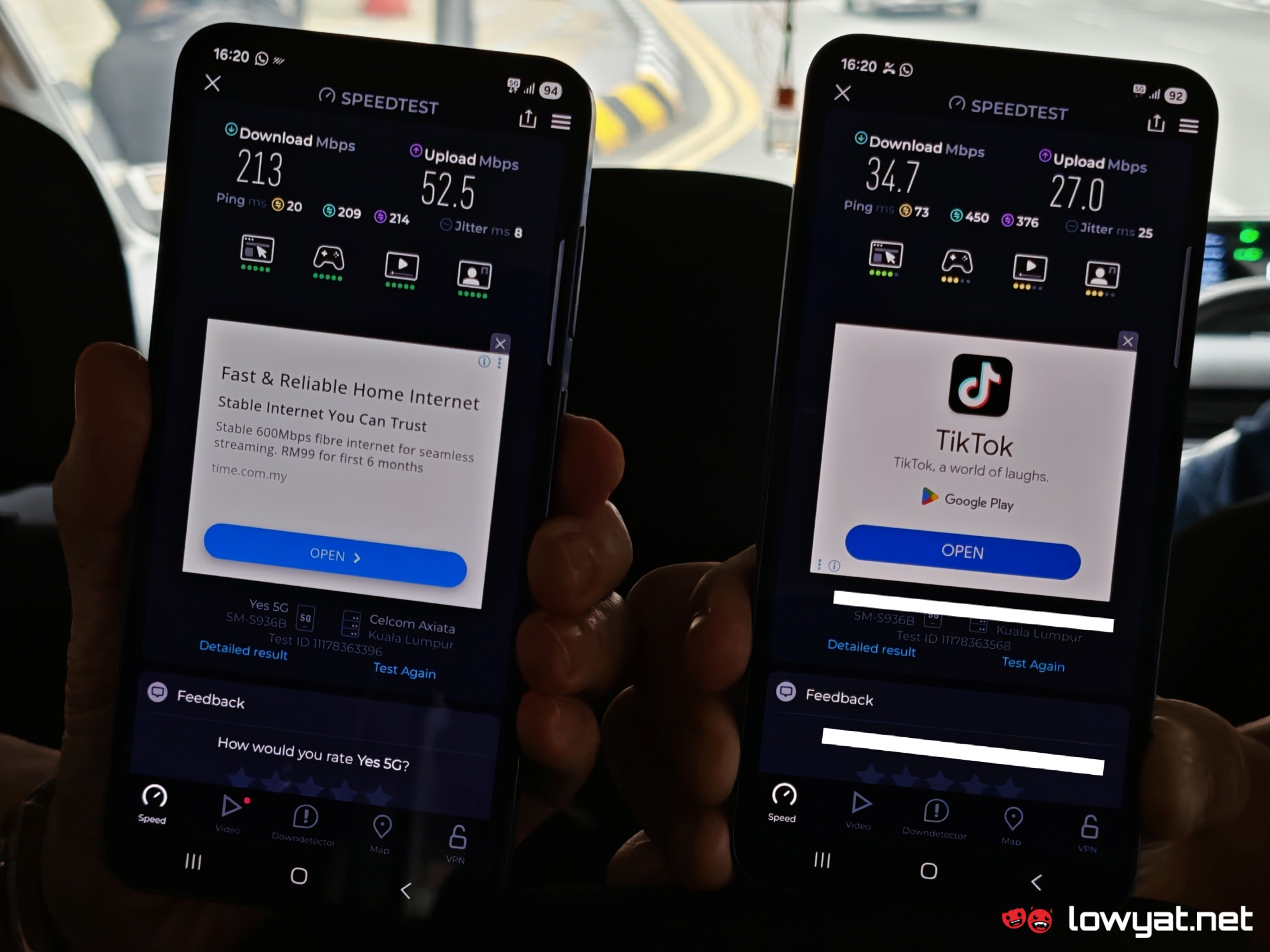 Our first stop was Menara KH, where we recorded a download speed of 213Mbps, an upload speed of 52.5Mbps, as well as 20ms ping. For comparison purposes, the same speed test was conducted using a separate device using a different network.