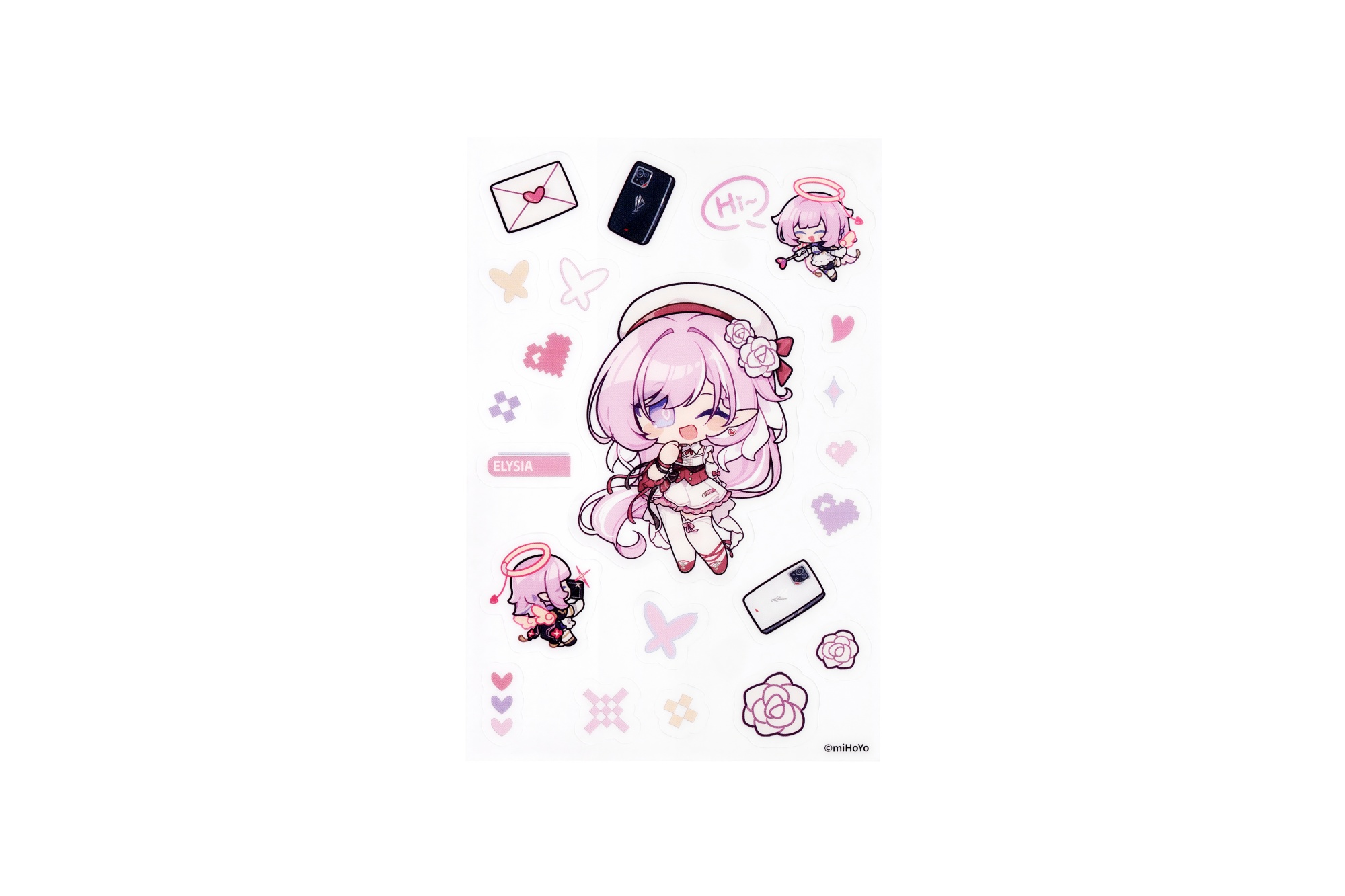As for the contents of the Elysia Special Collection, it includes seven collectible items. These include a card and envelope, an acrylic stand, a set of chibi stickers, as well as a badge. Aside from that, the box contains a SIM ejector pin, a cable guard, and a protective phone case for the ROG Phone 9 series. Naturally, these goodies prominently feature the character.