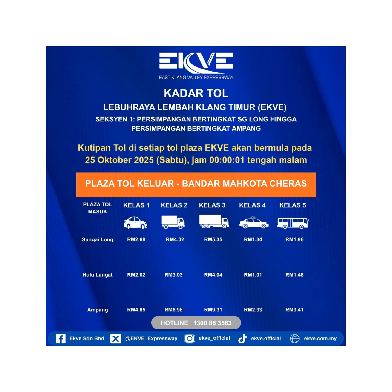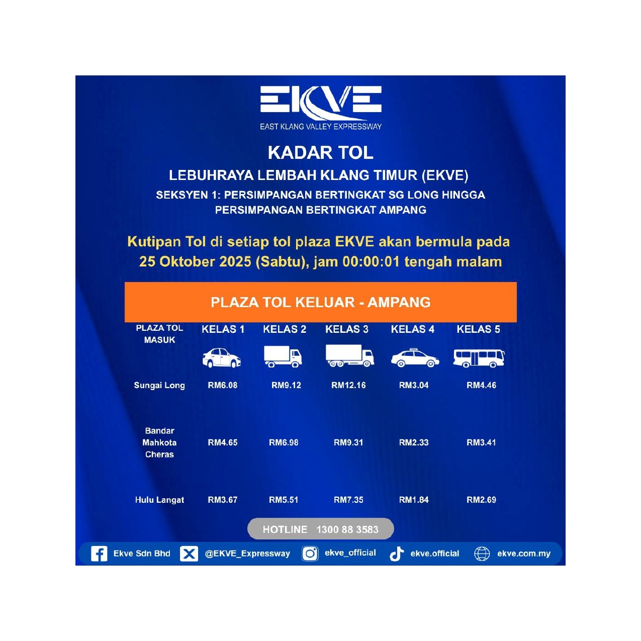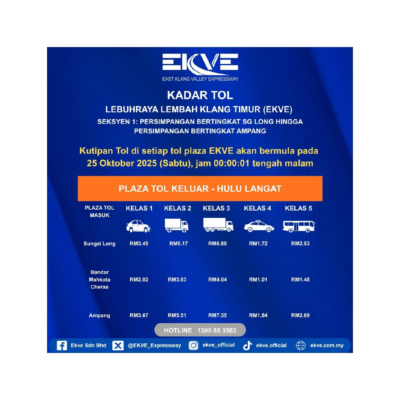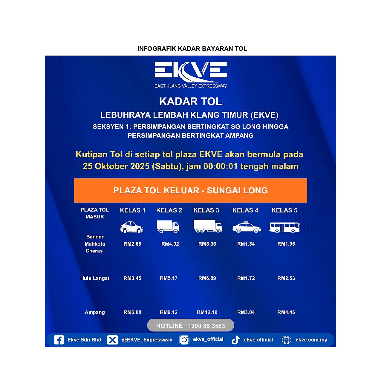 In a statement posted on its social channels, EKVE Sdn Bhd announced that toll collection will be fully electronic. Thus, payment can only be done via Touch ‘N Go, Smart Tag and RFID. Said statement also includes the toll rates based on vehicle classes, as well as points of entry and exit. In case you missed it, Section One of the EKVE has four interchanges – Sungai Long, Bandar Mahkota Cheras, Hulu Langat, and Ampang.