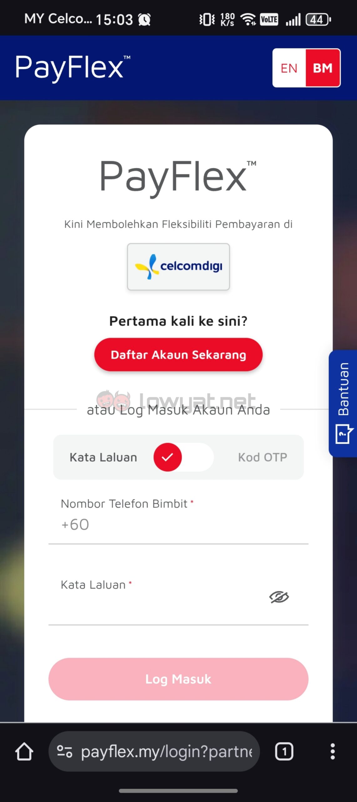 Clicking on the icon will redirect the user to the PayFlex login page. Naturally, the user will have to create a PayFlex account if they do not already have one. Otherwise, they can simply log in and access the available services. Some applications include paying postpaid bills, reloading prepaid credit, and making purchases from DuitNow QR merchants.