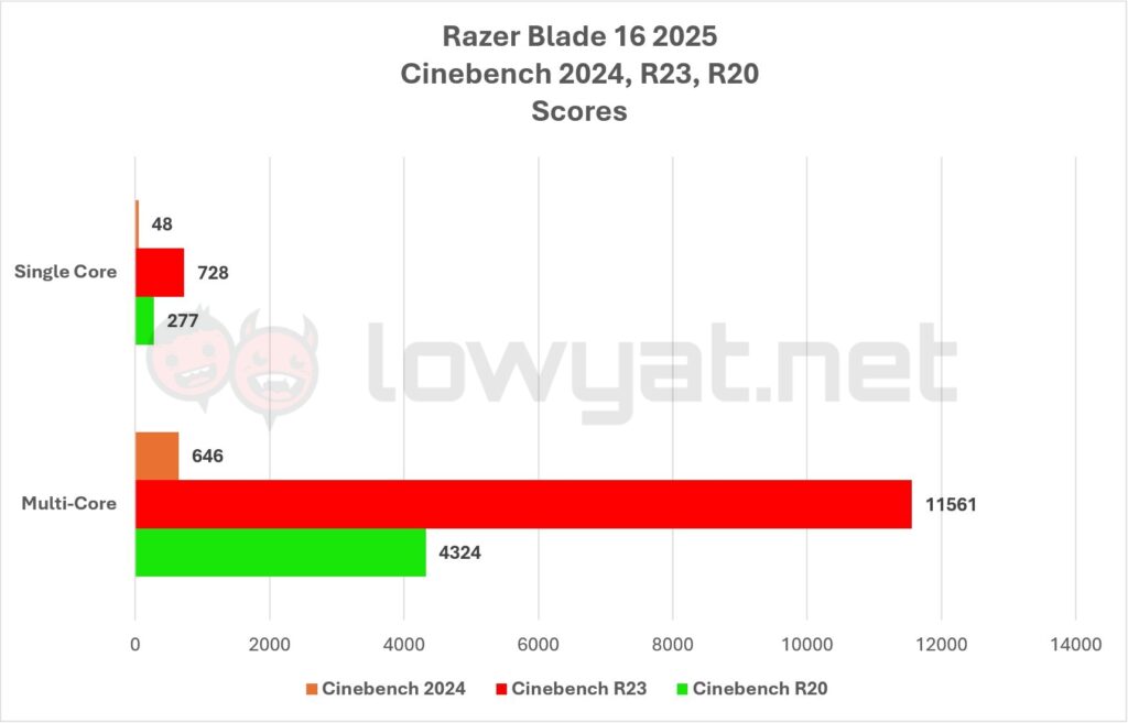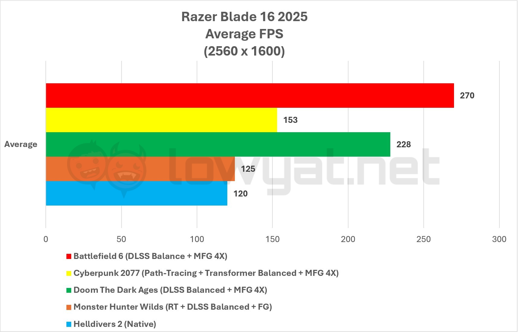 Because ray-tracing isn’t present in Battlefield 6 and with DLSS and Multiframe Generation (MFG) active, this laptop can comfortably maintain an average framerate well above 200 fps, with the occasional dips below 150 fps now and then. For a game like Doom The Dark Ages that has ray-tracing baked in, and with DLSS and MFG also turned on, I’m getting between 160 fps and 230 fps. More than plenty for me, as I’m not an esports player, nor am I gunning for the title. Synthetically, the Blade 16 2025 has issues running two tests, and those tests were PCMark 10 and the Blender benchmark suite. Besides those two, it ran the other tests perfectly fine.