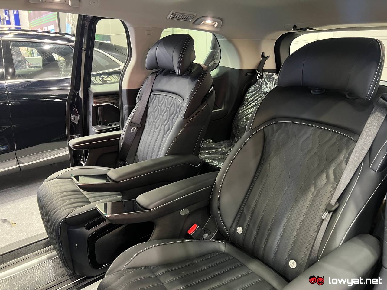 Inside, the Forthing V9 showcases a full-width display layout that appears to integrate three individual screens. Its flat-bottomed multifunction steering wheel is similar to the one found in the Friday SUV. As expected in this segment, the second-row captain’s chairs are the highlight, each offering powered adjustment, touchscreen controls, and an individual tray table for added comfort and convenience.