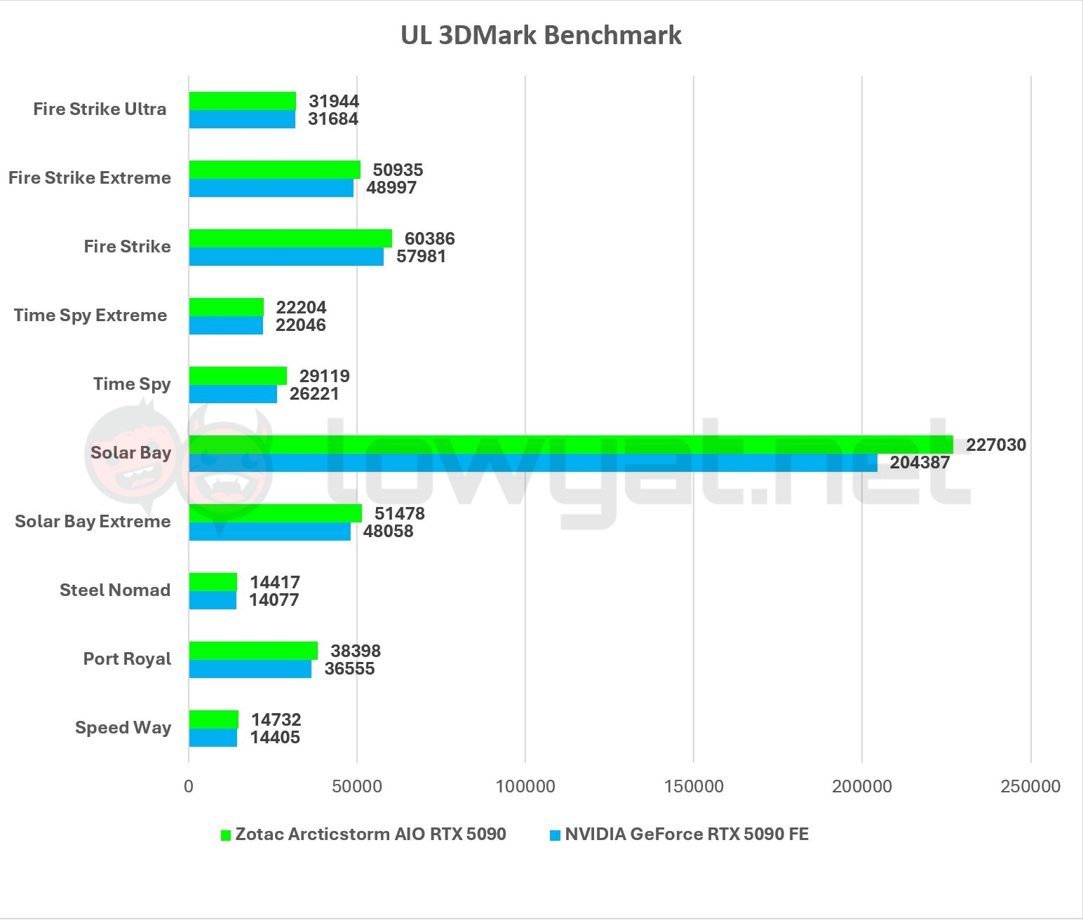 Synthetically, this card is still an RTX 5090, but as it has been given that extra layer of love through liquid cooling, the card can slightly outpace the RTX 5090 FE, albeit by a just a small margin. 3Dmark’s Solar Bay test, in particular, is the only test in which the card really pulls ahead of the FE, by approximately 10%.