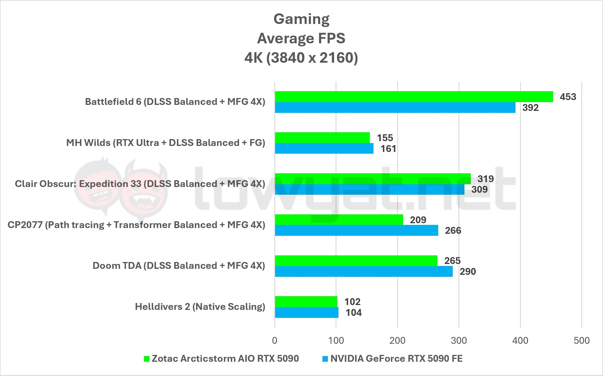 At the bare minimum, all my control titles run at more than 100 fps across the board, but again, there is an inconsistency in the framerates compared to the RTX 5090 FE. Take Battlefield 6 as an example: with DLSS and MFG turned on, there’s just no lack of frames that you can use the excuse “my framerate isn’t high”. Yet, at 4K QHD resolution, the card trails behind the RTX 5090 FE ever so slightly for a handful of titles.