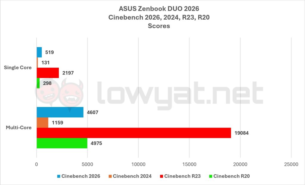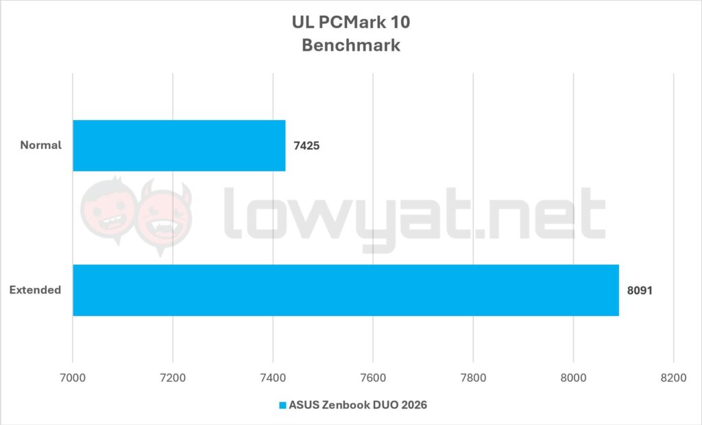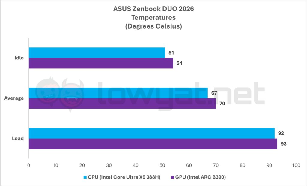Battery life is another milestone for Panther Lake, but more impressively, it’s another milestone ahead of Intel’s previous generation Lunar Lake. On a single display, the Core Ultra X9 388H on the Zenbook DUO 2026 gives me a near 18 hours on average. 18. That is far longer, and far more long-lasting than what I got with the Lunar Lake-based Zenbook S14 I reviewed years ago.