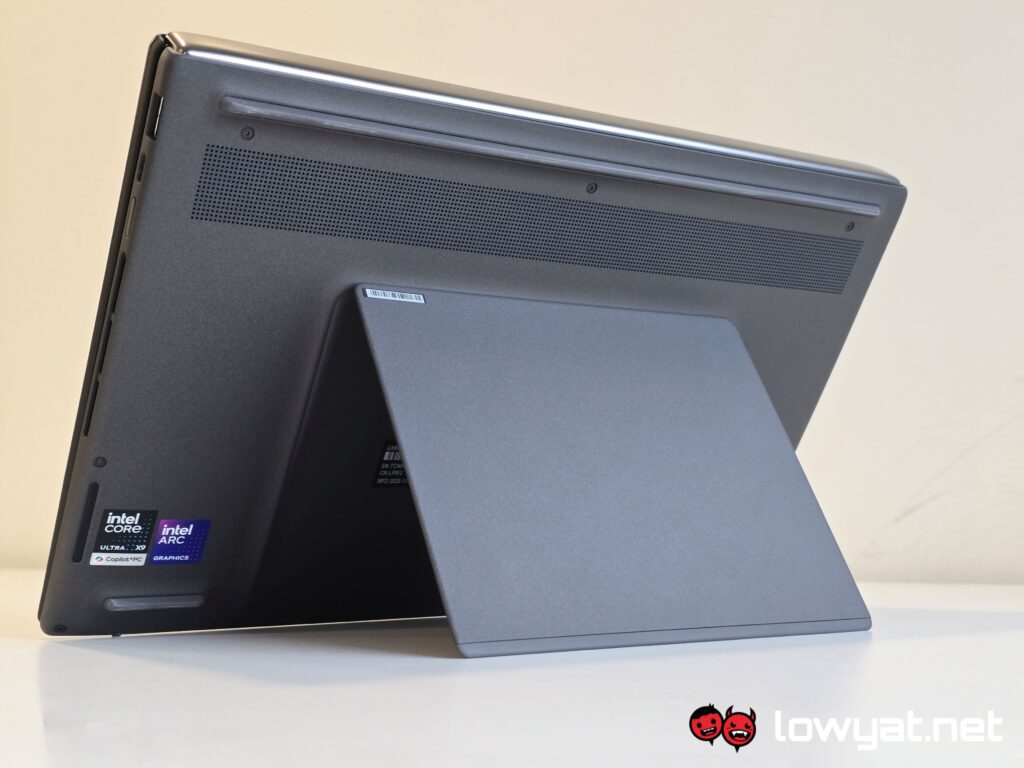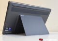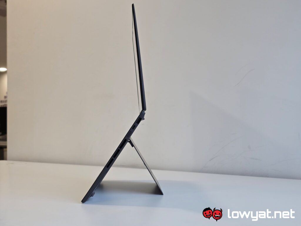 The Zenbook DUO comes with a built-in kickstand that is made of a solid piece of “Ceraluminum”, and with a hinge that is just as hardy. A bit of effort is actually required to deploy, but more to the point, it creates a gap between the surface and the top display, rather than sitting flush on the surface.