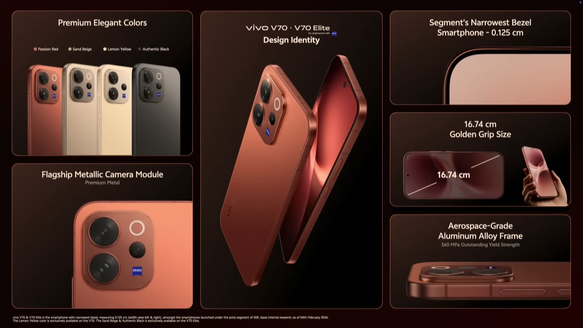 Looking at the two, the vivo V70 and V70 Elite share a 6.59-inch 1.5K 120Hz AMOLED screen, with up to 5,000 nits peak brightness. The base model gets a Qualcomm Snapdragon 7s Gen 4 chipset, while the Elite gets a Snapdragon 8s Gen 3 instead. Memory and storage configs for both range from 8GB + 256GB to 12GB + 512GB. They even share a 6,500 mAh battery, including their 90W charging and reverse charging support.
