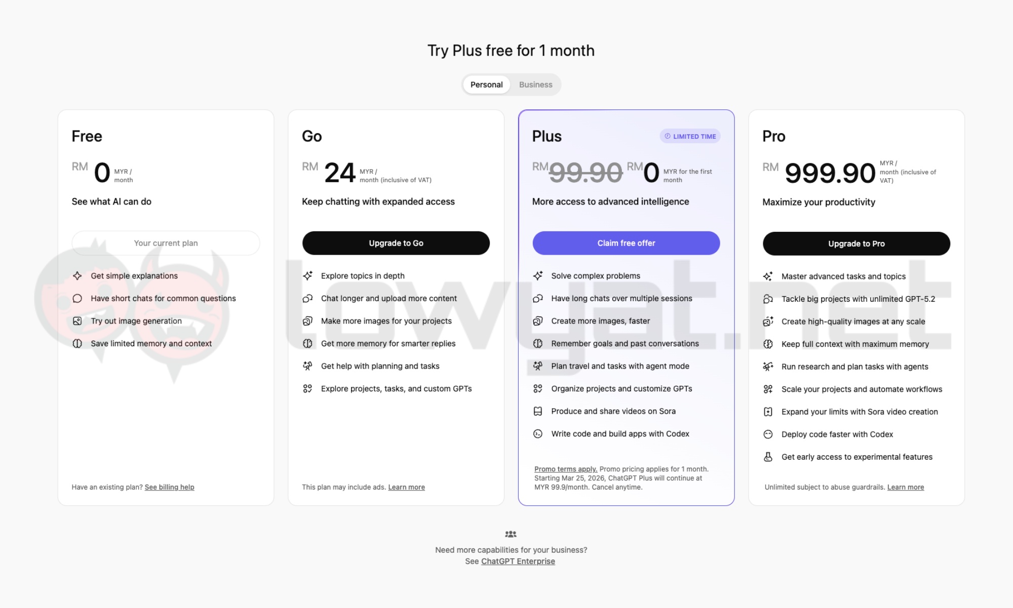 Access to more advanced tools like deep research and Sora video creation is limited to the Plus plan and above. Speaking of which, OpenAI is currently offering the first month of ChatGPT Plus free for those subscribing before 25 March 2026. Outside of this promotion, this tier is priced at RM99/month.