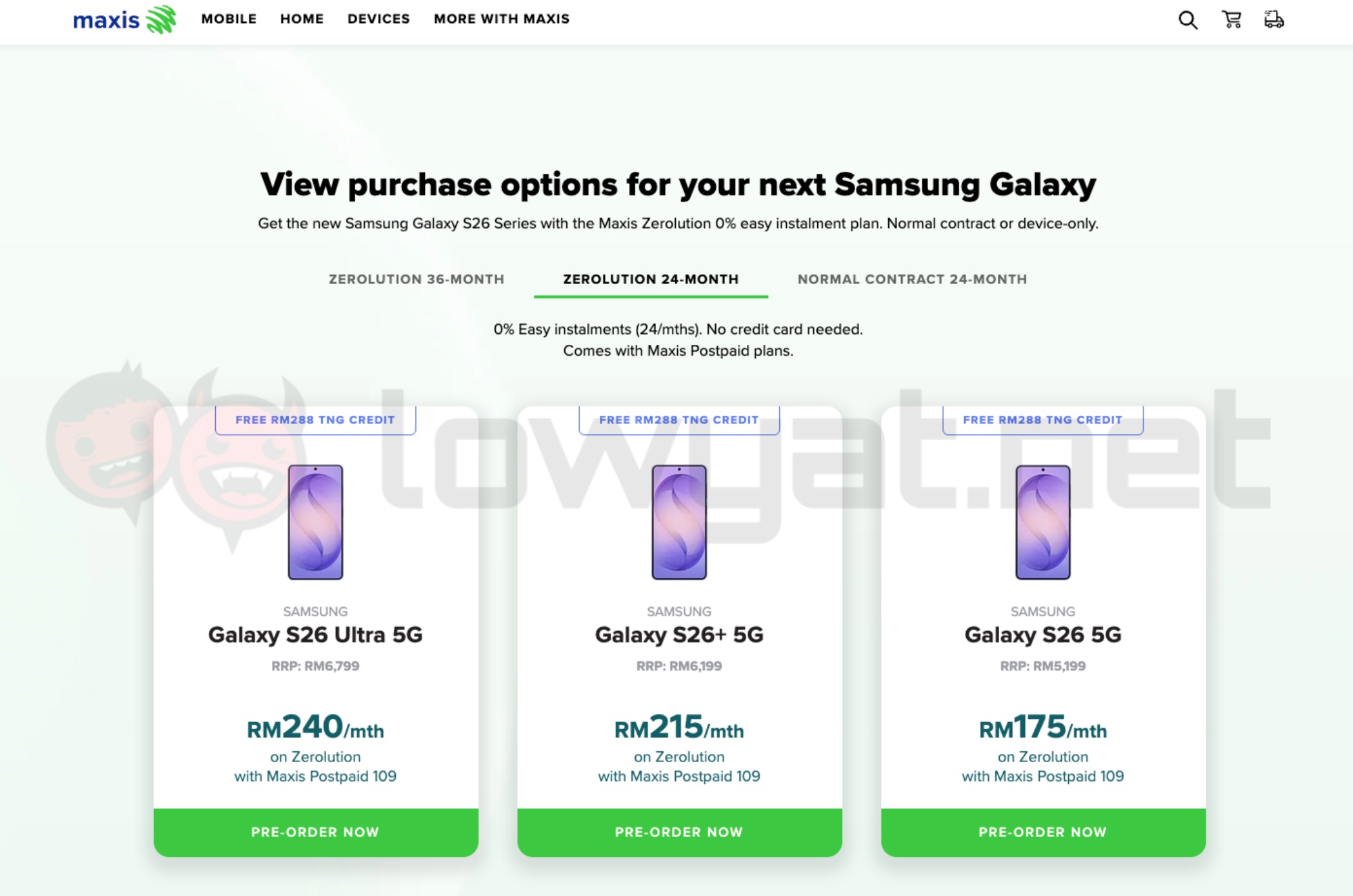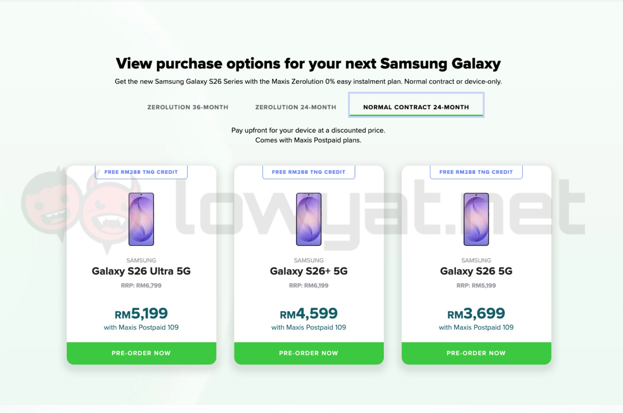 For Maxis, all three Samsung Galaxy S26 models are available for pre-order via its 36-month and 24-month Zerolution contracts, as well as a standard 24-month contract. The former two offer 0% instalment payments throughout their respective tenures, with no credit card required. Under the 36-month option, the base Galaxy S26 is priced at RM115 per month, the Galaxy S26+ at RM145/month, and the Galaxy S26 Ultra from RM165/month. The 24-month Zerolution plan, meanwhile, lists the models at RM175/month, RM215/month, and from RM240/month, respectively. Both Zerolution plans are tied to the Maxis Postpaid 109 subscription.