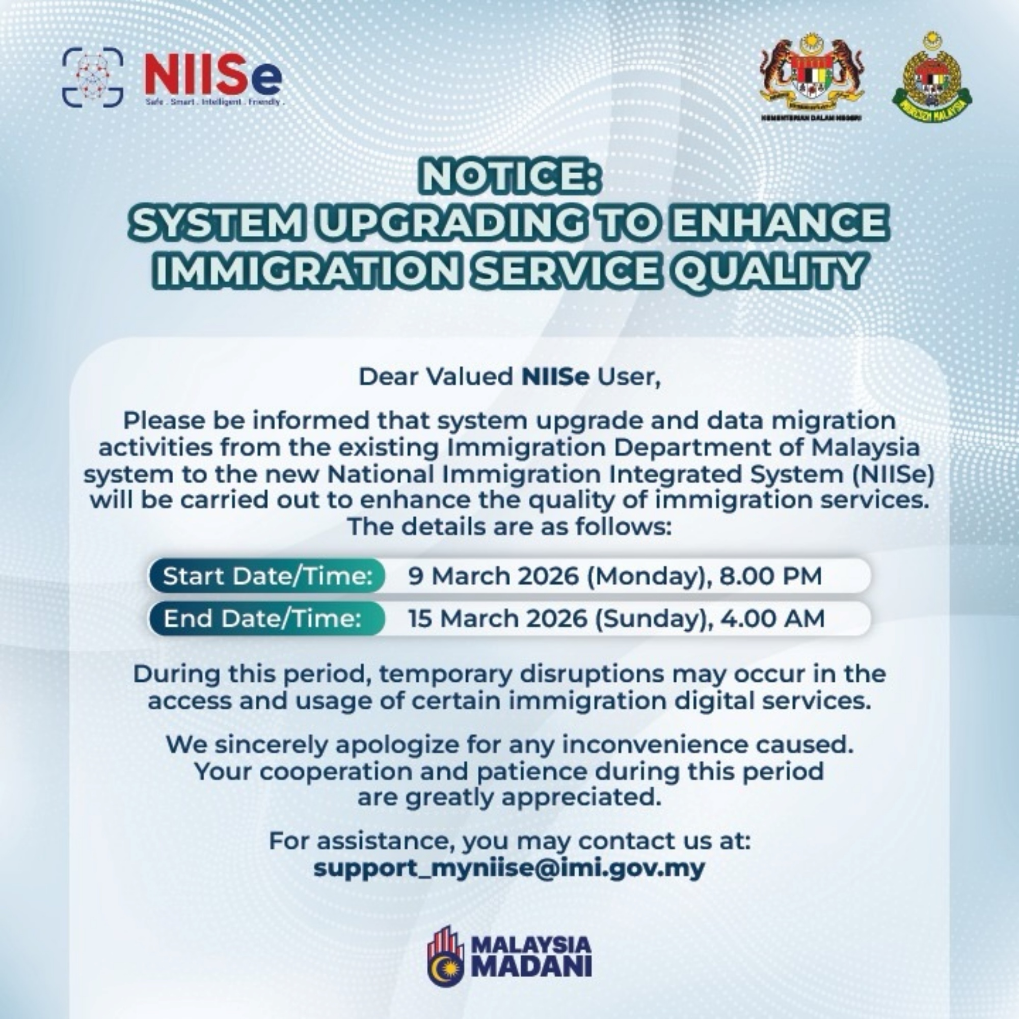 The Home Ministry has announced that it will be upgrading the National Immigration Integrated System (NIISe) throughout next week. To be more specific, NIISe will be undergoing maintenance from 9 to 15 March 2026.