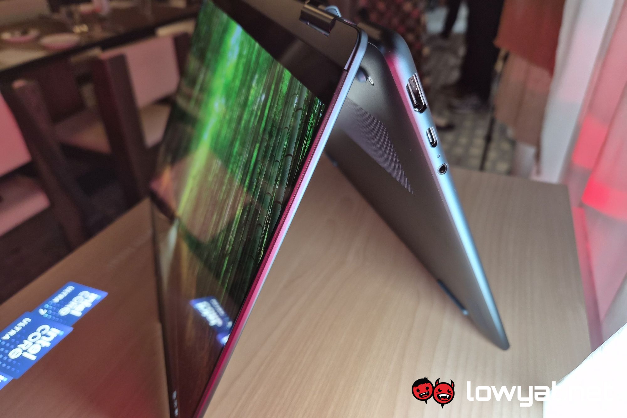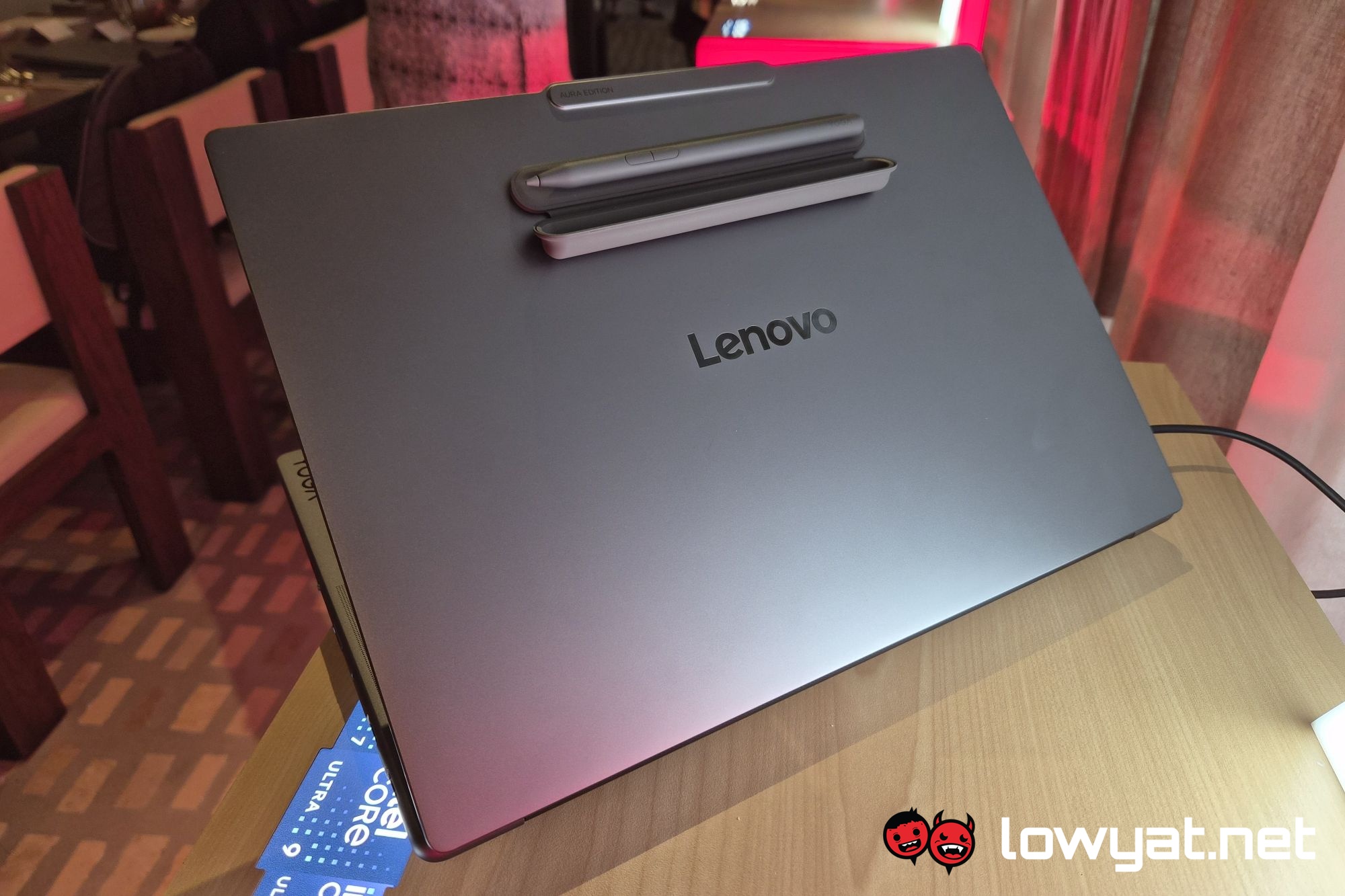 Speaking of which, moving on to the Lenovo Yoga Slim 7i Ultra Aura Edition. Beyond just being slim, it’s also the lightest model of the range, weighing in at less than 1kg. Or more specifically, 975g. As mentioned, this comes in a 14-inch form factor, with the display being a 2,880 x 1,800 16:10 OLED touchscreen with a 120 Hz variable refresh rate and a familiar 1,100 nits peak brightness.