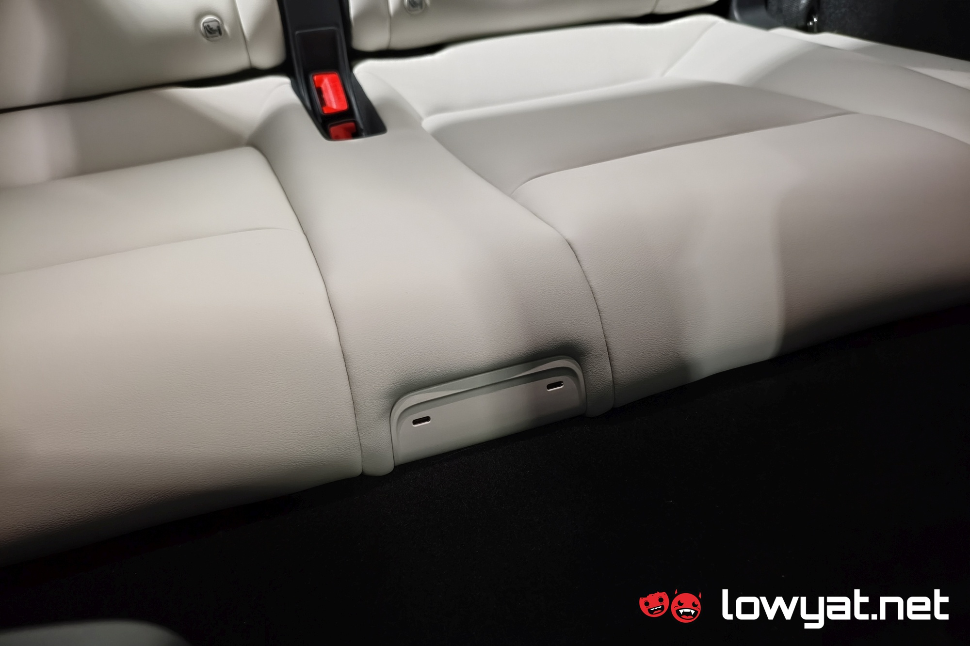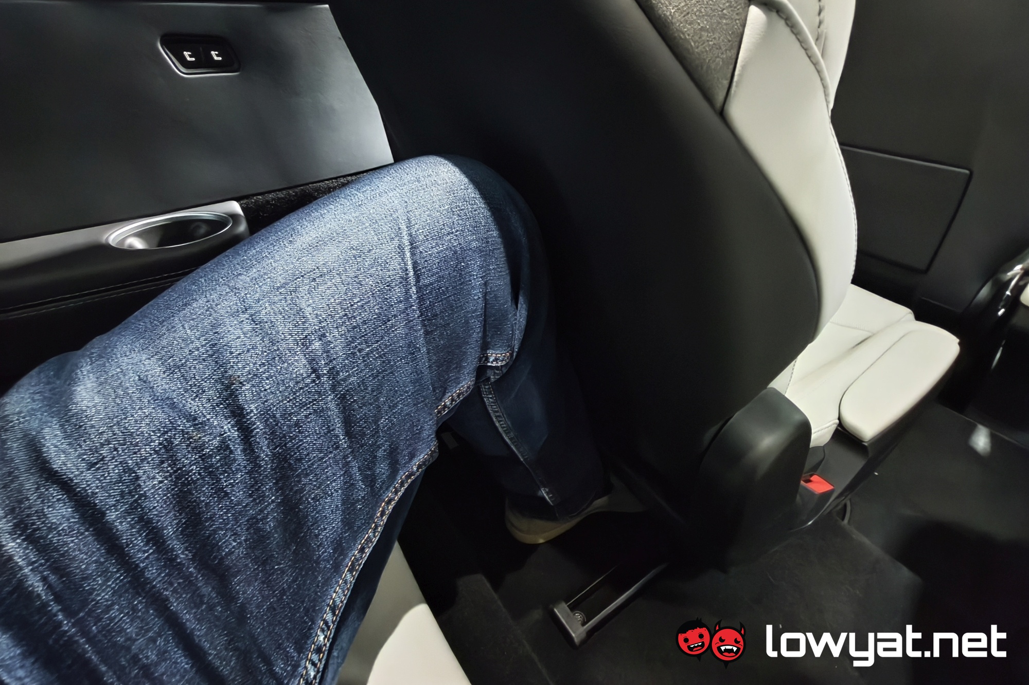 The amount of legroom at the back here depends entirely on the position of the middle row. And taller passengers will likely have the glass ceiling as a secondary headrest. Oh, and these don’t get adjustable headrests like the rows in front. The USB-C charging ports here are also in between the seats, a spot that’s liable to making you break your cables. For what it’s worth, you do get your own cup holders here.