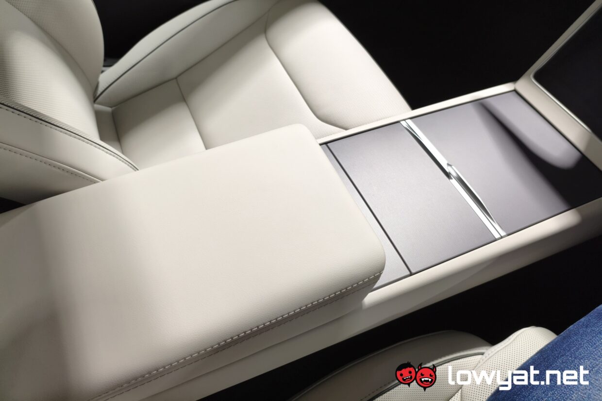 Inside, the centre console is mostly identical, from the dual wireless charging pads down to the 8-inch screen for the second-row passengers. That being said, the wireless chargers are now 50W and 30W for the driver and passenger sides respectively. The company also notes that the main screen in front measures 16 inches. And as with prior Teslas, you do just about everything from here. Even opening the glove box, believe it or not.