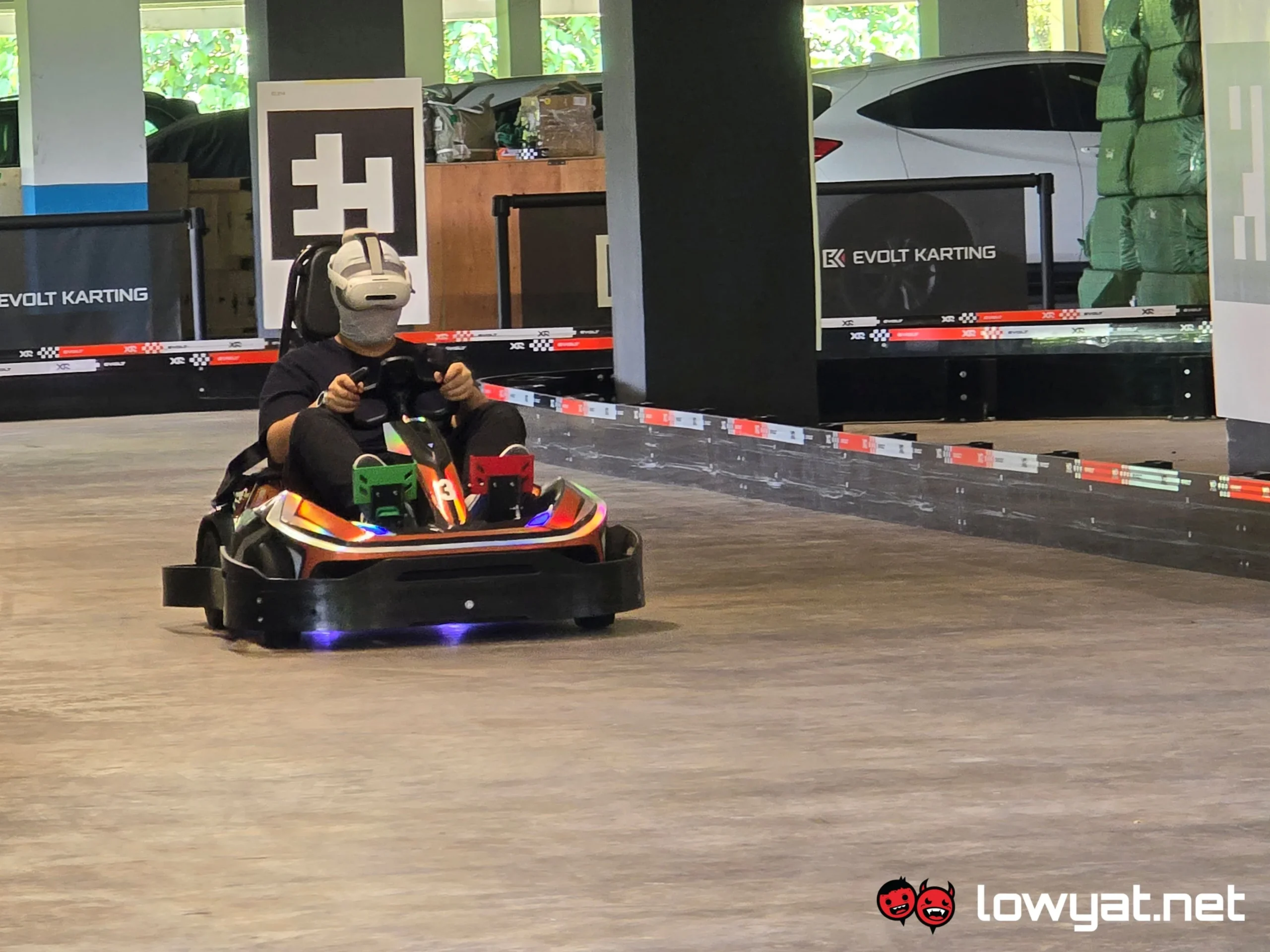 This…was possibly the more dangerous of the two experiences for me. Evolt’s goal here was obviously to add another layer of interactivity and family-friendliness to the electric go kart experience: you don the headset, wait for a bit, and the mixed reality experience kicks in.
