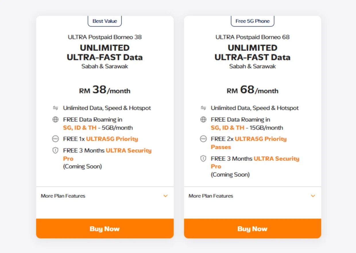 The offerings include ULTRA Postpaid Borneo 38 and 68, which stand out by offering unlimited data, speed, and hotspot usage, along with roaming data for neighbouring countries and bundled Priority Passes. On the prepaid side, ULTRA Prepaid Borneo offers a combined 2,000GB 5G quota and 200GB 4G quota with unlimited speed, hotspot, and calls for RM20 over 30 days.