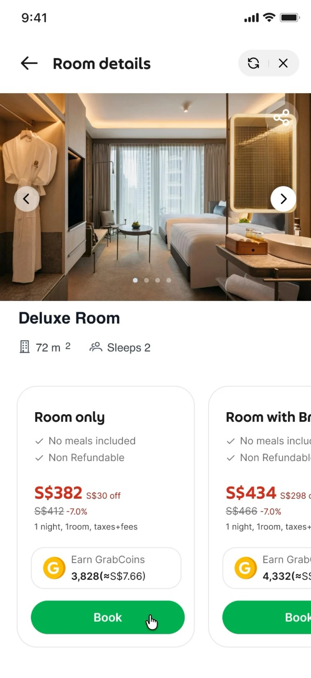 Complementing this is GrabStays, a hotel booking service integrated into the app and geared towards last-minute bookings. User details and payment methods are pre-filled, allowing bookings to be completed quickly, while ride options to and from the hotel are surfaced within the same flow.