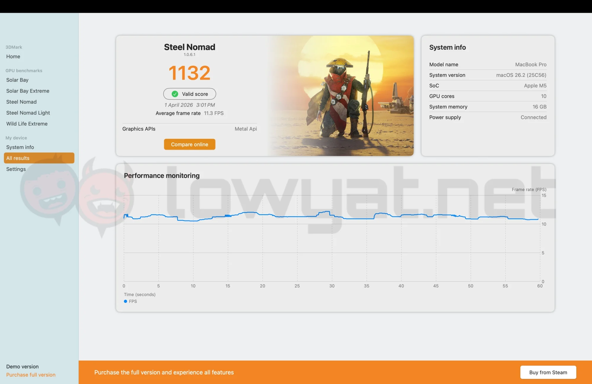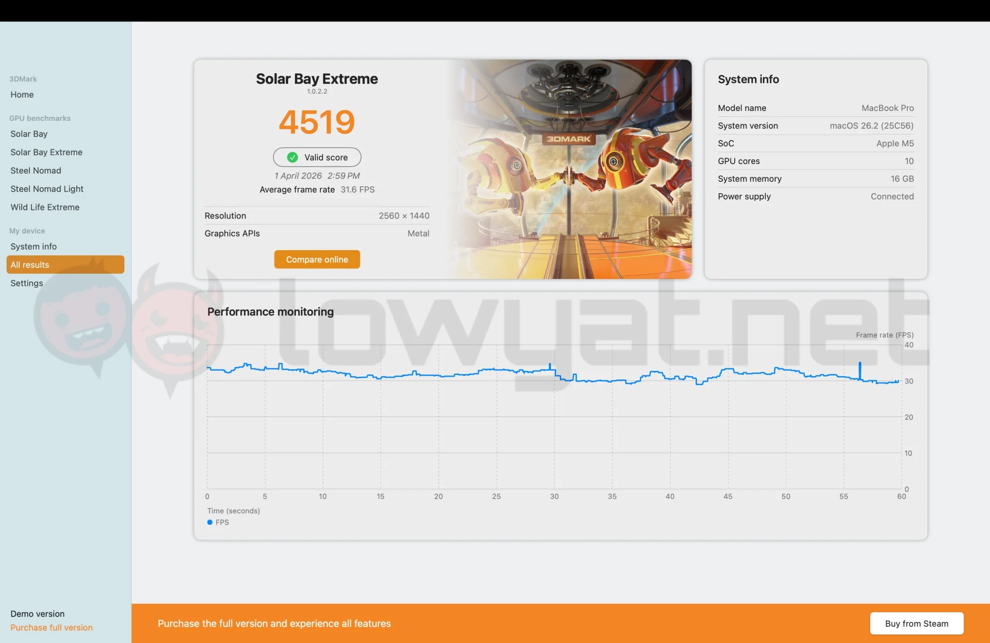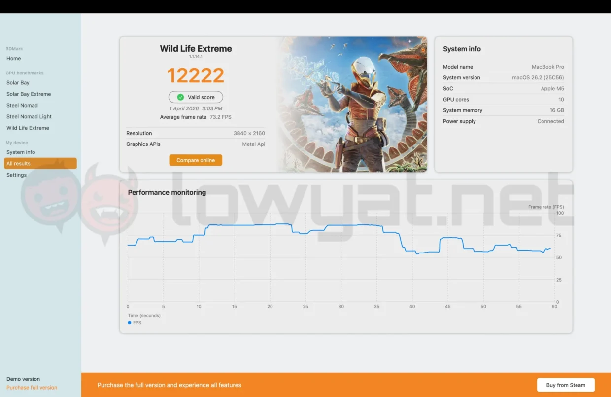 Benchmark results for the M5 are solid across the board. In Cinebench, it delivers impressive scores, occasionally topping certain charts while understandably falling behind more powerful systems, including Max and Ultra variants from both current and previous M-series generations. On the graphics side, it performs exceptionally well in 3DMark’s Wild Life Extreme and Steel Nomad tests, while maintaining around 30fps in the more demanding Solar Bay benchmark.