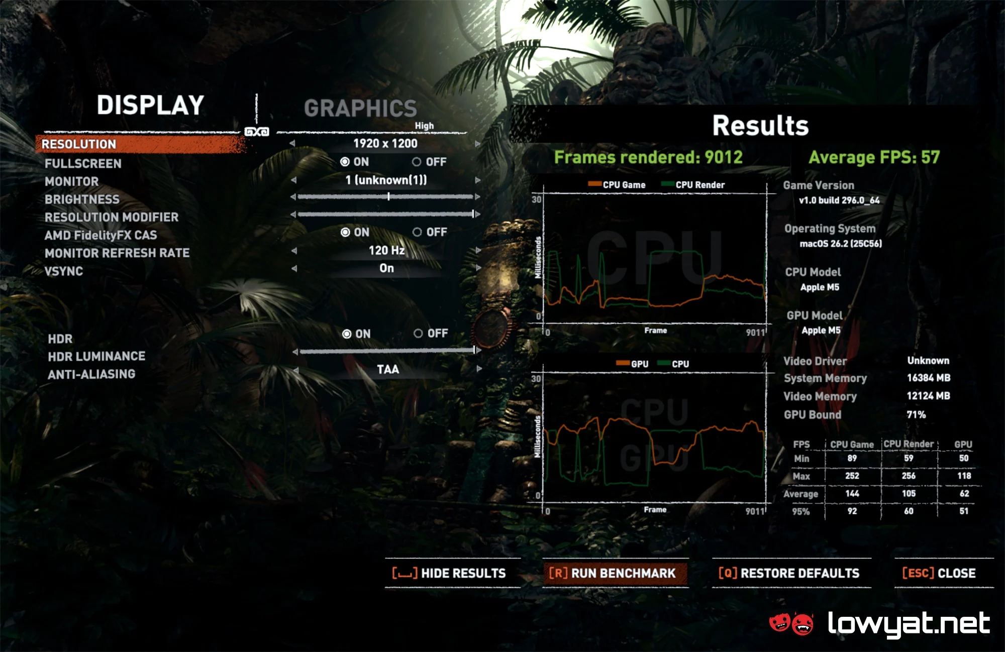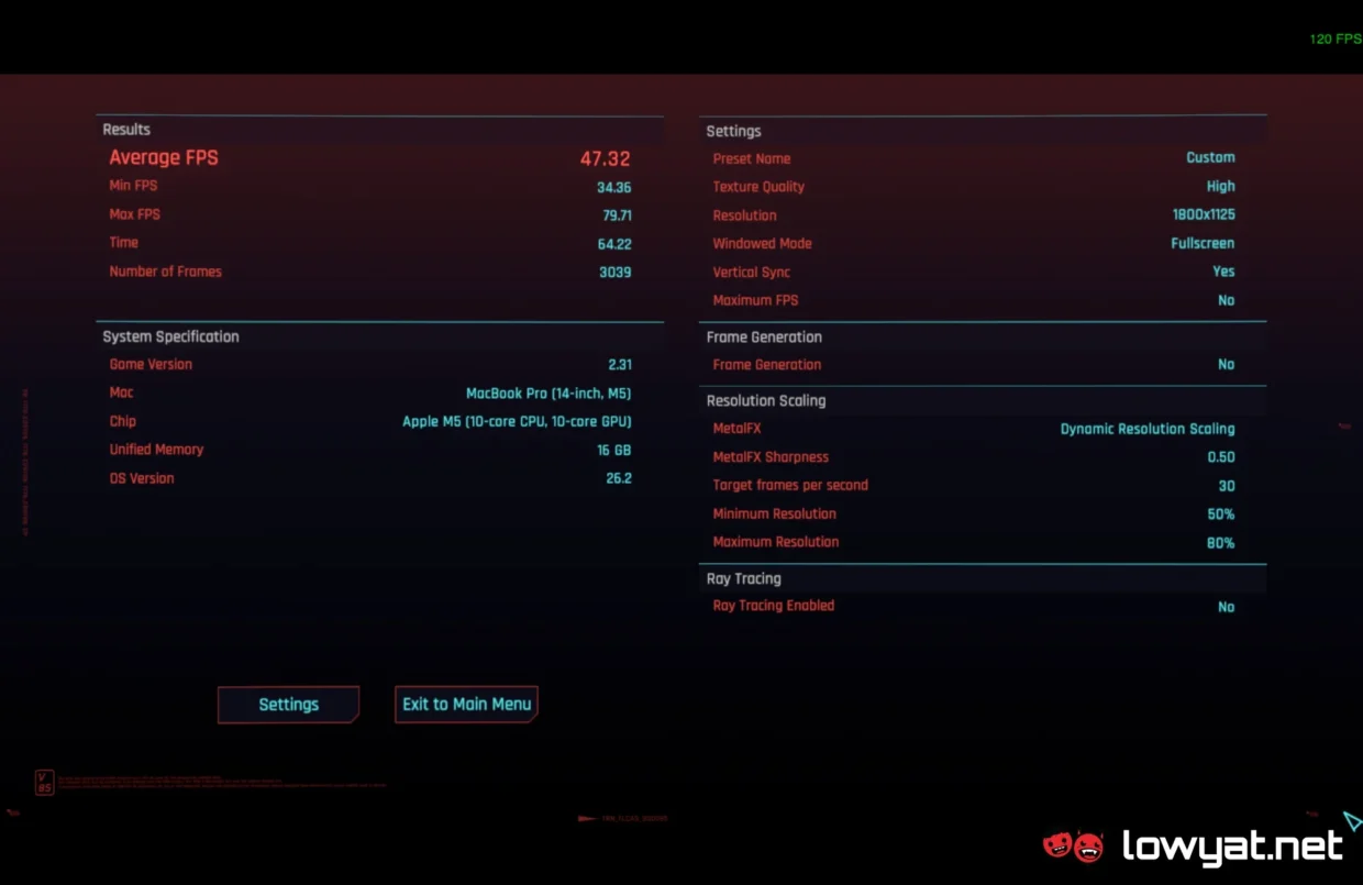 Gaming on a MacBook still feels like an afterthought for many, but the hardware is more capable than it’s often given credit for. The MacBook Pro M5 demonstrates this well, much like the M3 Max model previously reviewed by my colleague John Law. Built-in benchmarks show Rise of the Tomb Raider running at around 57fps on the highest settings, while Cyberpunk 2077 manages approximately 47fps on High. With Frame Generation enabled, the latter can climb to around 101fps. More impressively, the newly launched Crimson Desert runs at over 60fps on High settings, showing just how far Mac gaming performance has come.