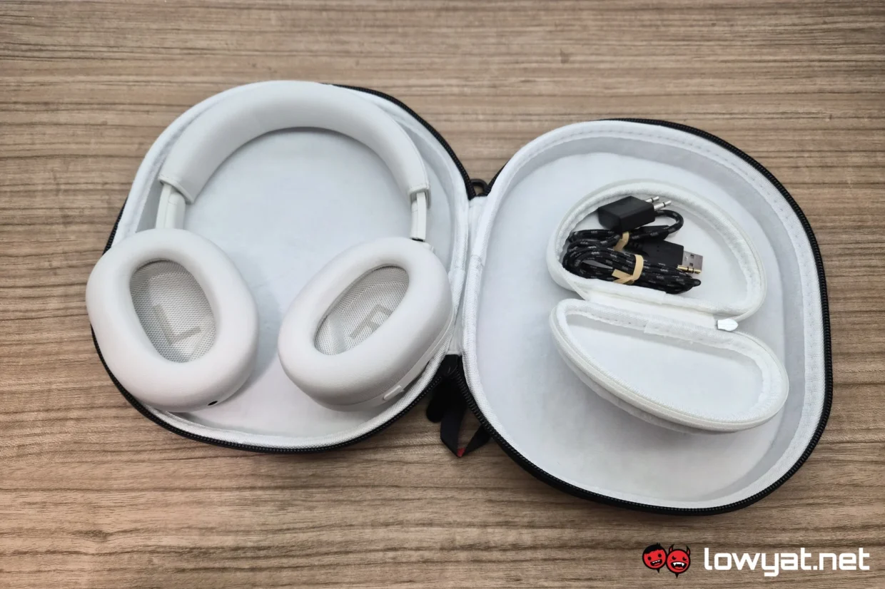 A bit more useful sits underneath the cushion of the left cup – the wireless dongle. This is for when the Bluetooth 5.3 just doesn’t cut it, for two primary reasons. One is when you need absolutely low latency, and during such times, you engage Low Latency Mode from the dongle itself. The other is when you want lossless audio, (96kHz/24-bit), during which you switch to the Lossless Mode. Of course, If you’re absolutely old school, the good ol’ 3.5mm audio jack is there. The cable is provided in the box as well.