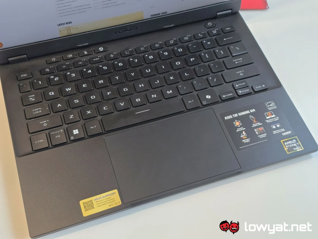 This year’s TUF Gaming A14 looks no different from past models, at least in its chassis design. In the case of my review unit, you get the same gunmetal grey colourway, the same keyboard layout – media buttons at the top-left, while the power button gets an isolated corner at the top-right – that features backlit LEDs, but if you’re hoping for RGB LEDs, allow me to disappoint you by saying no: it’s just white.