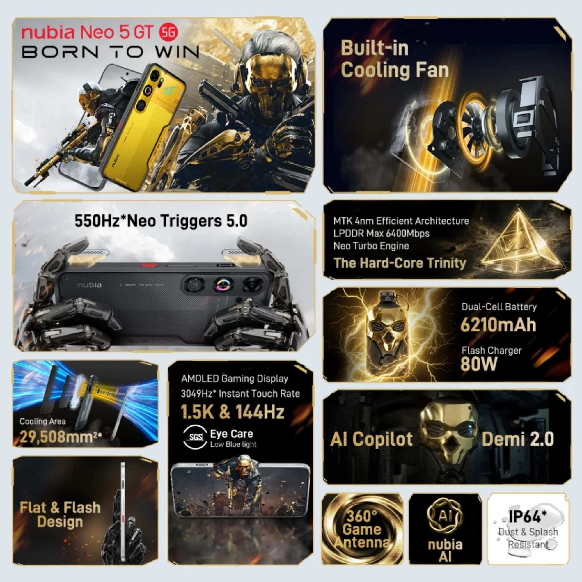 nubia already revealed this model’s specifications last month, but in case you missed it, here’s a quick refresher. The Neo 5 GT comes with a 6.8-inch AMOLED display with a 1.5K resolution, a 144Hz refresh rate, and 4,500 nits of peak brightness. Of course, the phone also gets 550Hz shoulder triggers and RGB lighting. In addition to this, the device boasts a built-in cooling fan.