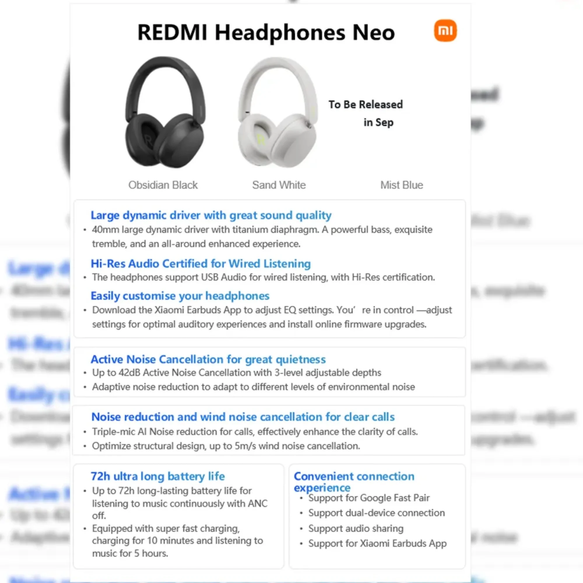 For connectivity, the Headphones Neo will rely on Bluetooth 5.4. Aside from that, it will allegedly support Google Fast Pair, dual-device connection, and audio sharing. The device will also connect with the Xiaomi Earbuds App, which will allow access to EQ settings.